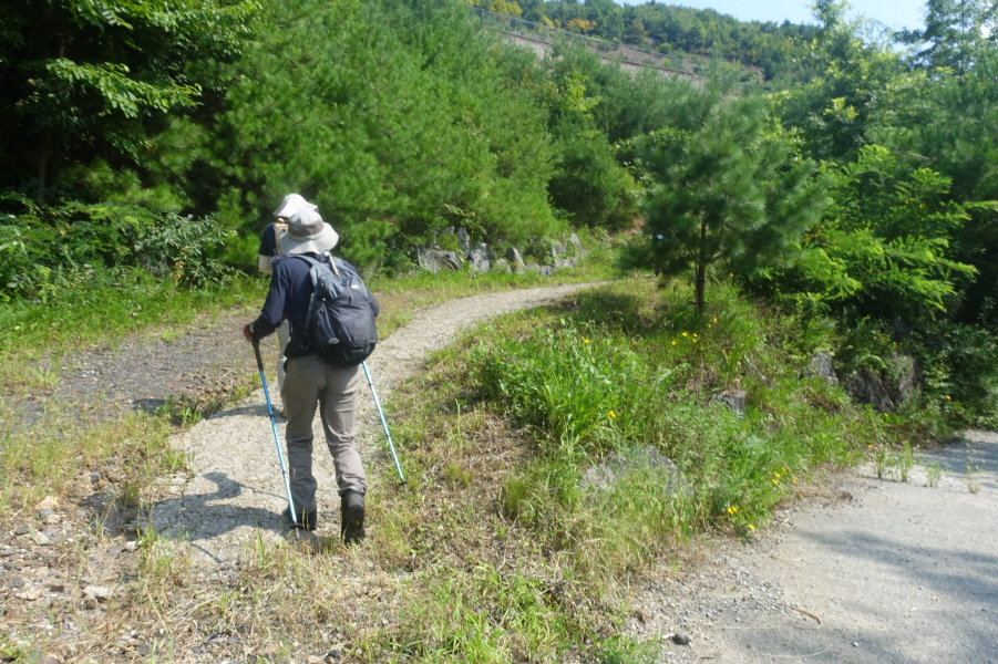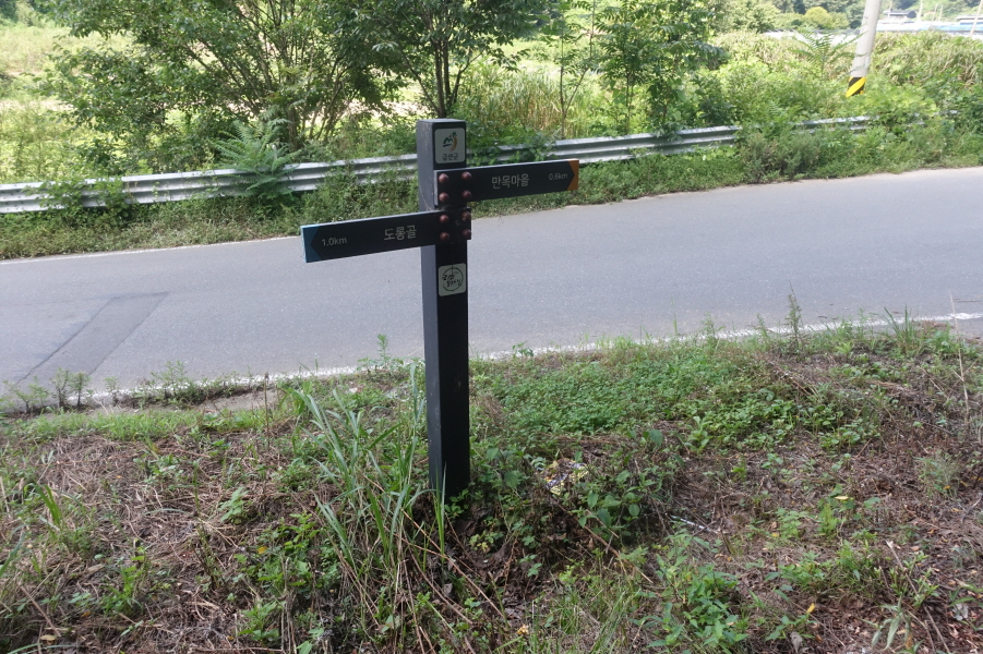 (11;13)금산둘레길 이정표(만목마을0.6km/도룡골1.0km)서 있는 아스팔트도로에서 이정표 (만목마을0.6km) 방향 도로따른다. 햇살이 땡볕이라 우산 받고 그늘 없는 도로를 간다.3거리에서 만목마을길을 보내고 좌향 도로 따른다.도로는 (11;22)개인과수원 내 주택에서 비포장 임도로 변하고 끝난다.[1.6km][35분]
