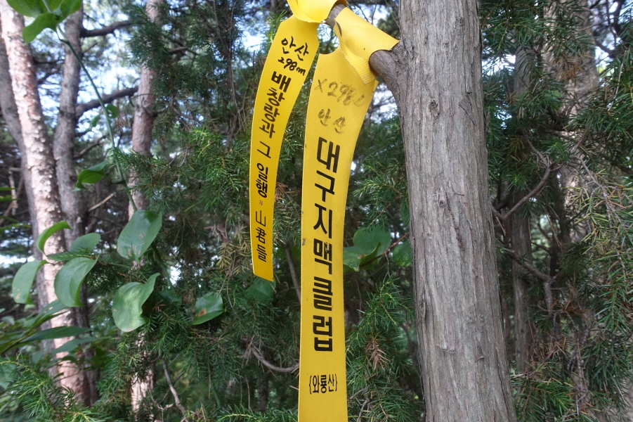 주원명가 입간판 도로 따른다. 3거리에서 아래 도로따르고 도로가 곡각되는 지점 3거리에서 잠긴 문 가장자리 정원석을 밟고 좌측임도 따른다. 야자수매트까지 깔인 임도는 등산로가 분명한데 사유지 인듯 낮은 철문을 설치 잠가 놓은 인심이 야박하다.임도는 지그재그 오르는 형태다.임도 따라 능선에 붙어 숲길로 들어서 잠간 오르니 (10;22)안산(1)(333m)정상이다.[0.8km][17분]
