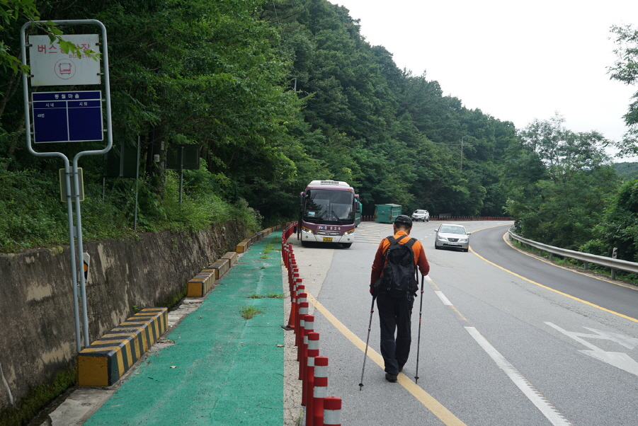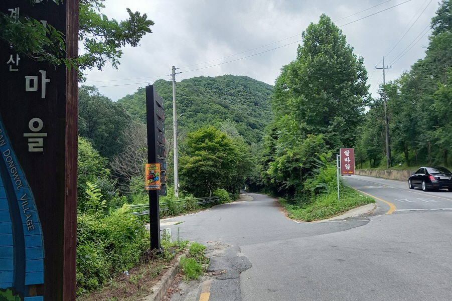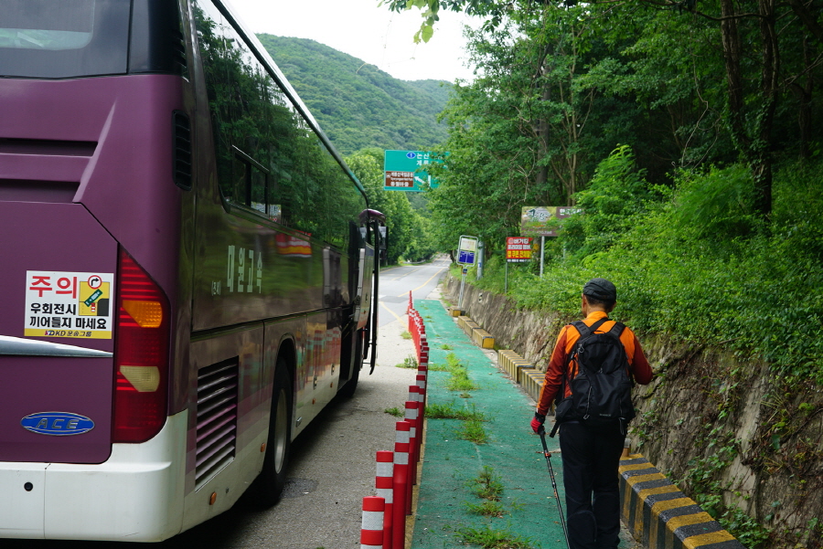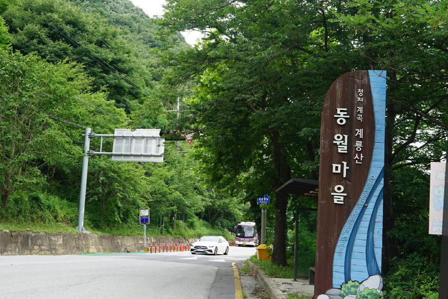 (11;10) 뒤돌아본 청정계곡 동월마을 입간판과 주차된 산악회 날머리버스입니다
