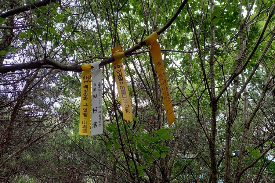 신상호 님, 이강일 님, 김명근 님 표지기 걸린 봉래산(304m) 정상이다.