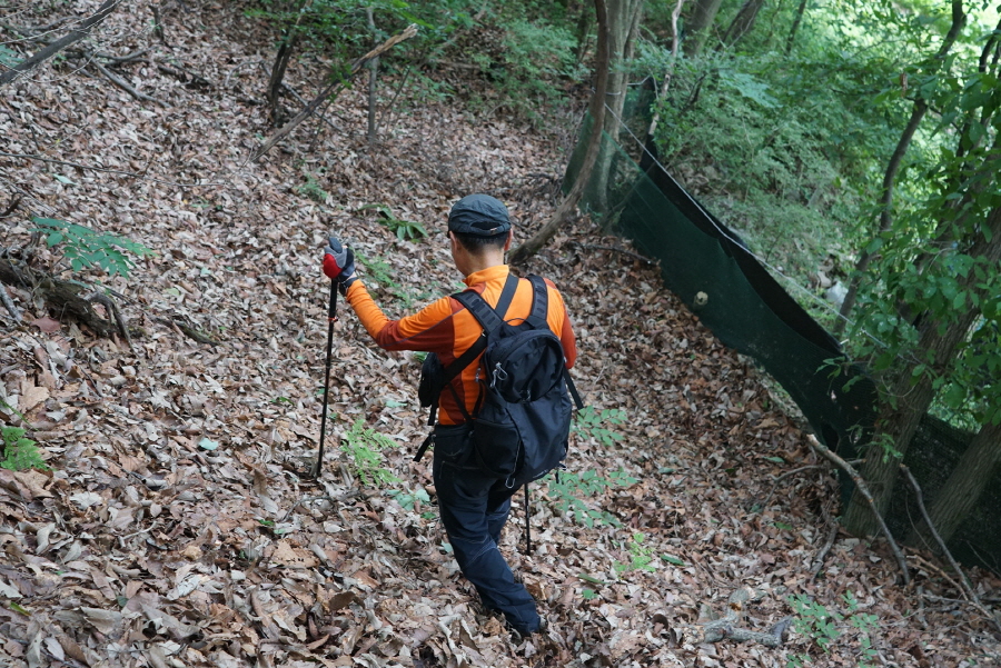 (11;01) 봉래산에서 직진으로 희미한 길 따라 때로는 개척으로 급경사를 치고 내려서니 철조망과 검은 비닐천으로 막은 울타리 때문에 좌측으로 우회합니다
