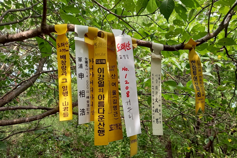 선답자님들의 표지기 많이 걸린 도래산(277m) 정상이다.