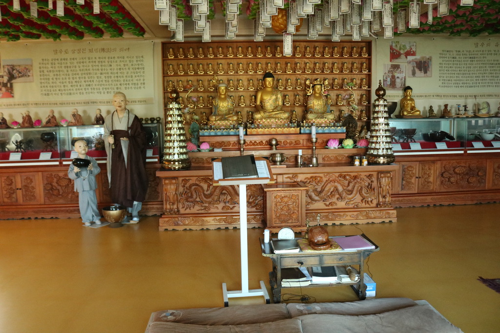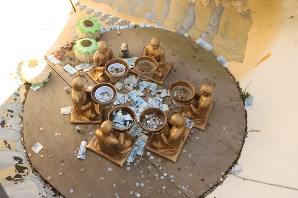 ▼ 법당 앞에는 커다란 발우(鉢盂)가 놓여있다. 계단을 딛고 올라서니 발우의 안에도 부처님이 모셔져 있다. 발우를 들고 있는 승려상(僧侶像)도 보인다. 그들 주변에는 지폐와 동전들이 수북하다. 발우 안에 동전이 들어갈 경우 소원이 이루어진다는 속설을 믿는 사람들이 꽤 되는 모양이다.