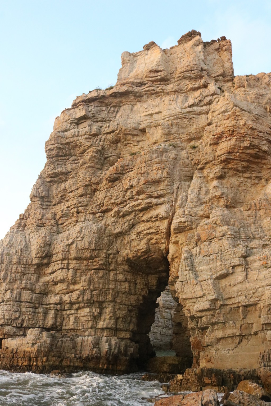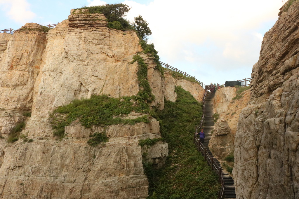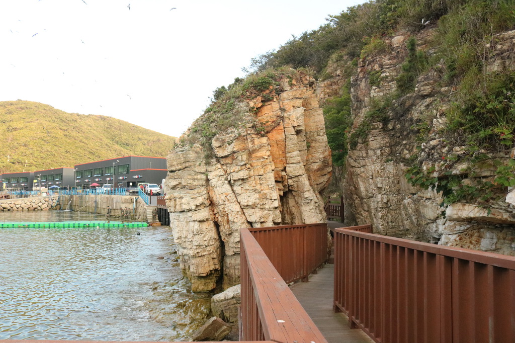 ▼ 탐방로를 걷다보면 포구 건너편으로 늘어선 해식절벽이 눈에 들어온다. 잠시 후에 만나게 될 두무진의 바위들과 함께 해식지형의 변화과정을 살펴보는 중요한 자료가 아닐까 싶다. 해식절벽에서 해식동굴을 거쳐 ‘씨 아치(sea arch, 독립문처럼 암석 기저부가 뚫린 다리모양의 파식지형)’로 변하고, ‘씨 아치’가 세월이 흐르면 ‘시스텍(sea stack, 암석이 파도의 침식을 차별적으로 받아 만들어진 굴뚝 형태의 지형)’이 되기 때문이다.
