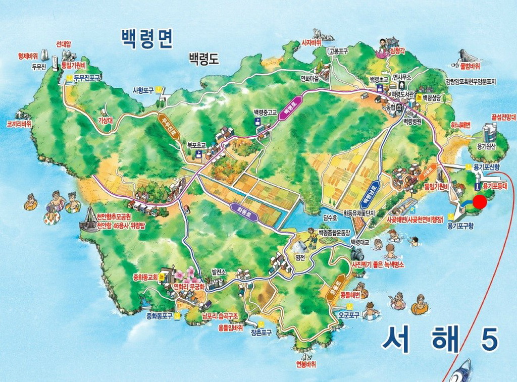 특징 : 인천에서 북서쪽으로 191km 가량 떨어진 서해 최북단의 섬으로 북한과 가장 가까운 위치에 있다. 북한 땅인 황해도 장산곶과 고작해야 13㎞ 거리이기 때문이다. 지금은 비록 경기도(옹진군)이지만 광복 전까지만 해도 황해도의 장연군(長淵郡)에 속해있었던 이유이다. 위치가 위치인지라 섬의 인구 분포는 주민 반, 군인 반이다. 그렇다고 삭막한 분위기는 아니다. 백령도의 자연이 품고 있는 절경 때문이다. ‘서해의 해금강’이라 불리는 ‘두무진’을 비롯해 효녀 심청의 이야기가 깃든 심청각, 작고 둥근 자갈이 깔린 콩돌해변, 천연비행장이라는 사곶해수욕장 등 보석 같은 풍광들이 여행자를 맞이한다. 참고로 백령도의 원래의 이름은 곡도(鵠島)였다고 한다. ‘곡(鵠)’이 고니(白鳥)나 따오기를 가리키는 한자말이니 백조가 많다는데서 유래된 이름이 아닐까 싶다. 그러다가 섬의 지형이 따오기가 흰 날개를 펼치고 공중을 나는 모습처럼 생겼다 해서 백령도(白翎島)로 고쳐 부르게 되었다는 것이다. 역사적으로 이 섬은 유배지로 이용되었다는 것도 기억해 두자.
