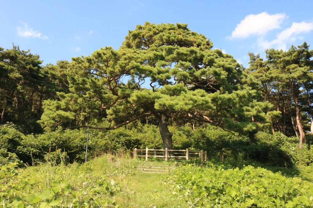 ▼ 중화동 교회로 가는 길에 장촌마을(長村里)에 들렀다. 지금은 비록 메밀칼국수 집이 있는 곳으로 더 유명하지만 이곳에 400년이나 묵은 노송(老松)이 자라고 있기 때문이다. 도로에서 100m쯤 올라가면 만날 수 있는데 입구의 안내판에는 400년 전인 조선시대 선조 때 마을 사람들이 심은 것으로 전해져 온다고 적혀있다. ‘천년송(千年松)’이라는 이름까지도 붙여놓았다. 기껏해야 조선 왕조와 역사를 같이 했을 나무이지만 천년 동안 마을을 보호해 줄 것이라 믿었던 이곳 섬사람들의 바람이 아니었을까 싶다. 동네 사람들의 할아버지. 그 이전부터 ‘천년송’이라 불러왔다는 것이 증거이고 말이다.