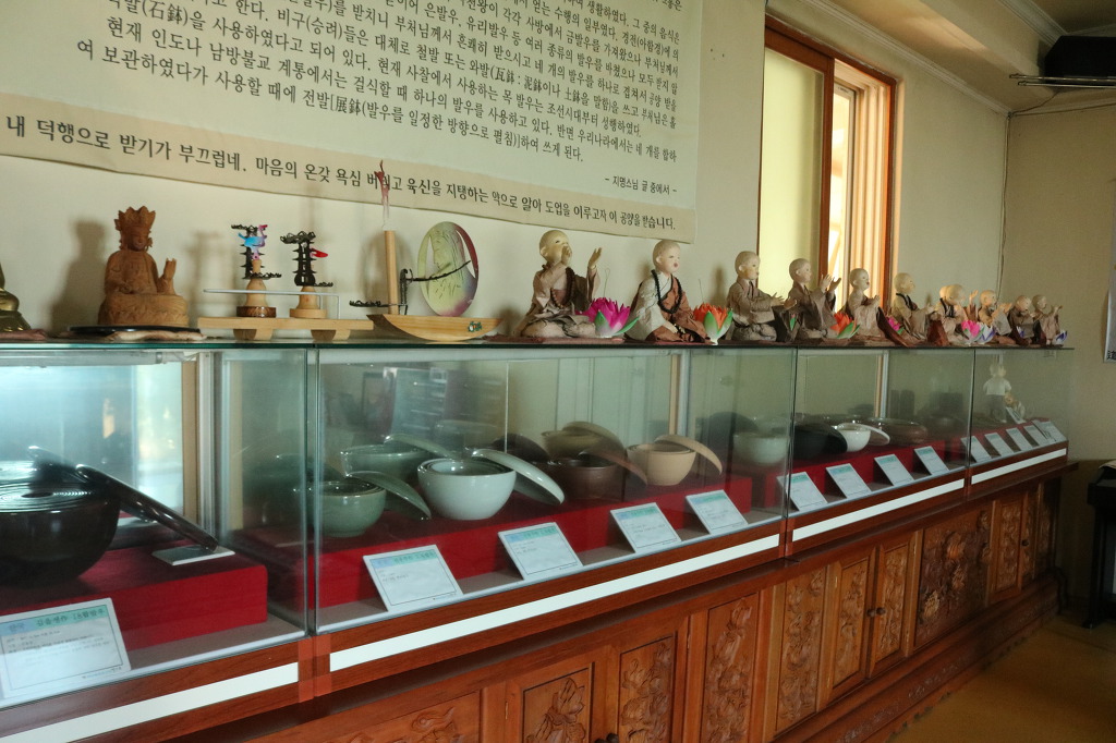 ▼ 법당으로 들어서자 주지인 지명(智明)이 모았다는 발우(鉢盂)들이 중생을 맞는다. '일발삼의(一鉢三衣ㆍ발우 하나와 옷 세벌)'라는 말처럼 발우는 탁발에 의지해 무소유의 삶을 사는 출가 수행자들의 표상이다. 특히 선종에서 발우는 밥그릇 이상의 의미가 있다. 그것은 수행의 매개이며, 초조 달마대사로부터 육조 혜능대사에 이르기까지 선사들이 제자들에게 깨달음을 전한 전법(傳法)의 상징이었다. 그런 발우들을 100여 벌이나 모았다는 것이다. 구하(1872~1965)스님, 석주(1909~2004)스님 등 국내의 여러 노스님들이 썼던 발우뿐만 아니라 티베트의 정신적 지도자 달라이라마, 대만 불광산사의 성운스님, 미얀마의 우꾸마라 스님, 태국의 프라자라타나 몰리스님 등 외국의 유명한 고승들의 발우도 있다는데 일일이 확인해 보지는 못했다.