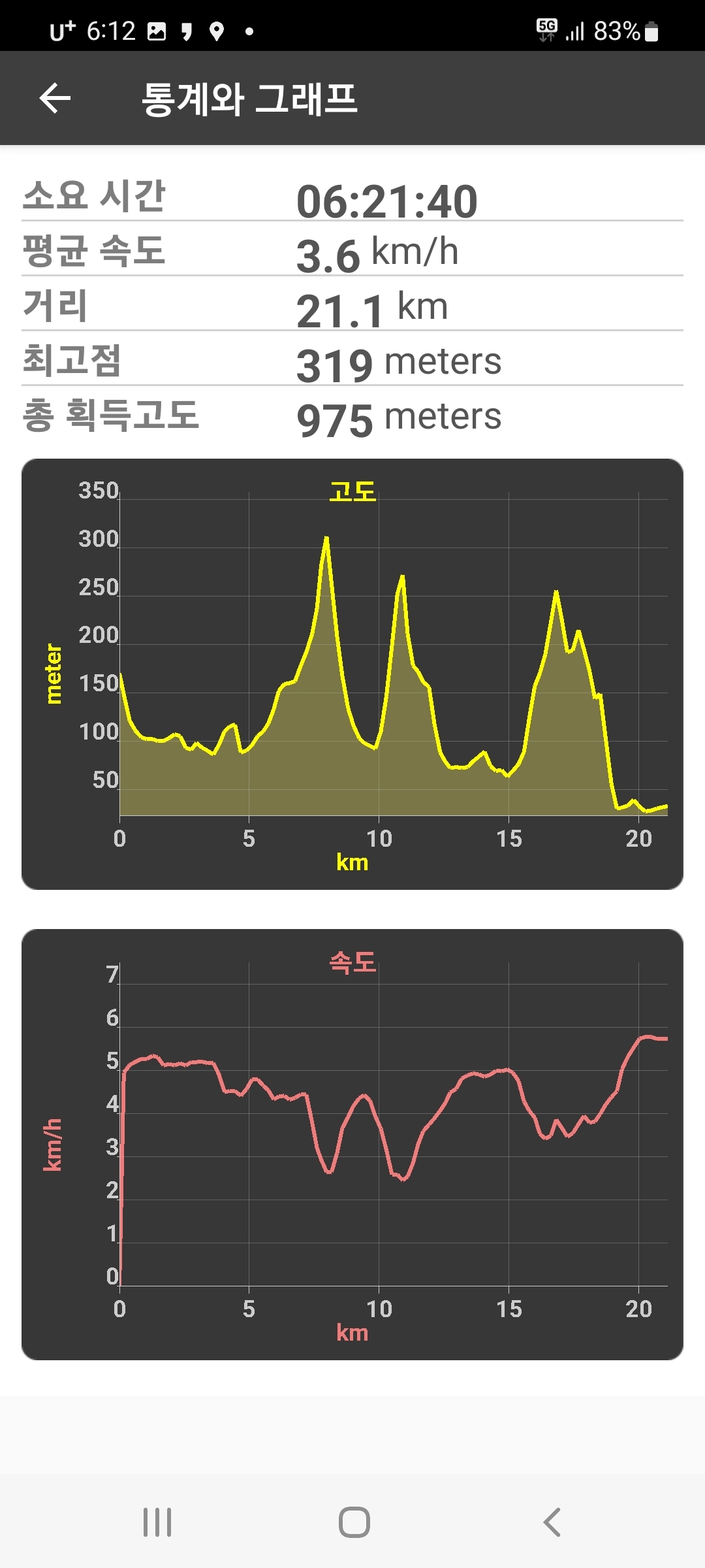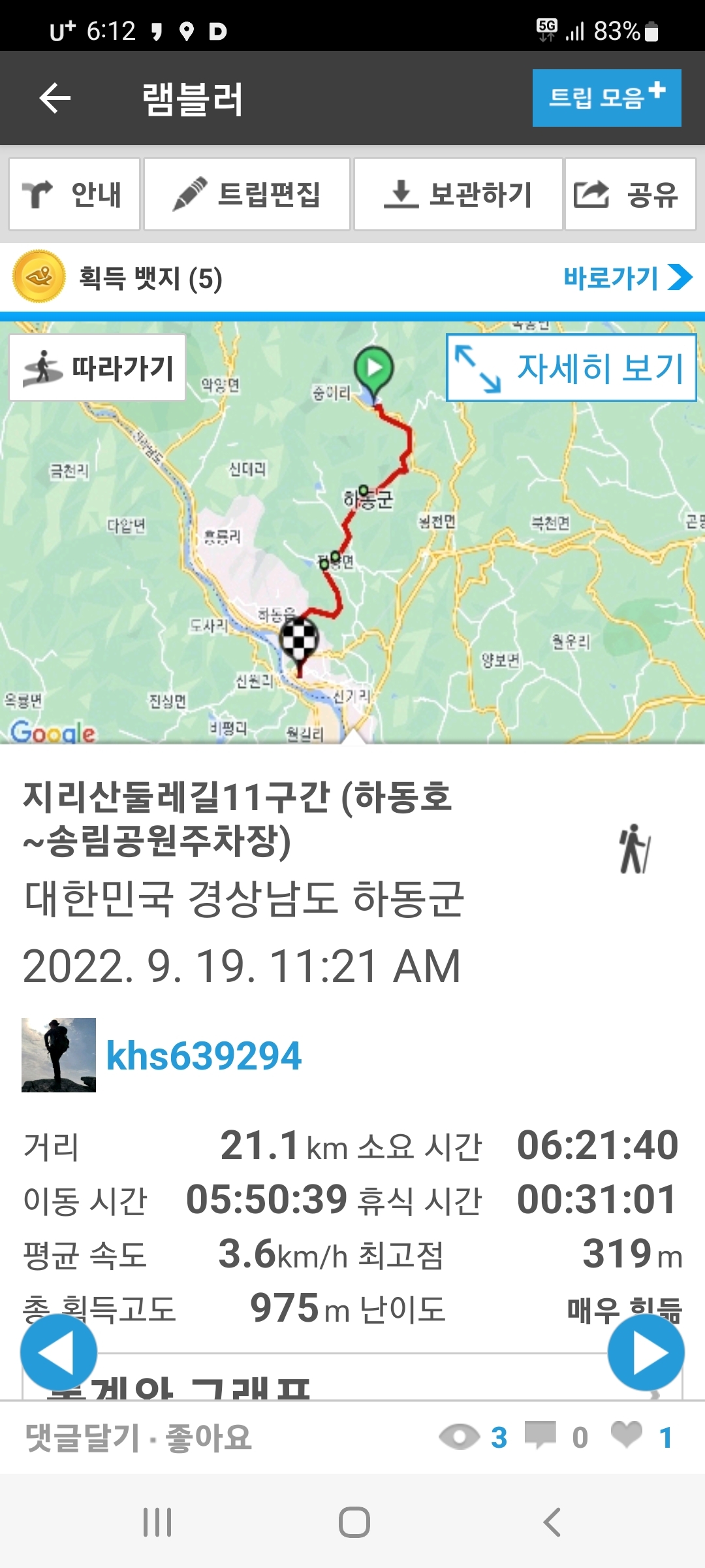 [국내여행]지리산둘레길 11구간 (풍경 넉넉한 마음도 부자되서 가네.지천이 먹을것) 작성자얼쑤.|작성시간22.09.19|조회수146 목록 댓글 0 글자크기 작게가 글자크기 크게가 http://rblr.co/OfThG지리산둘레길11구간 (하동호 ~송림공원주차장)활동 : 등산/하이킹 | 소요 시간 : 6h 21m 40s | 거리 : 21.1 km (13.1 mi) | 총 획득고도 : 975 m (3,199 ft) | 최고점 : 319 m (1,047 ft) | 평균 속도 : 3.6 km/h (2.2 mi/h)www.ramblr.com 다음검색 현재 게시글 추가 기능 열기 북마크 공유하기 신고 센터로 신고 댓글 댓글 0 댓글쓰기 댓글 리스트