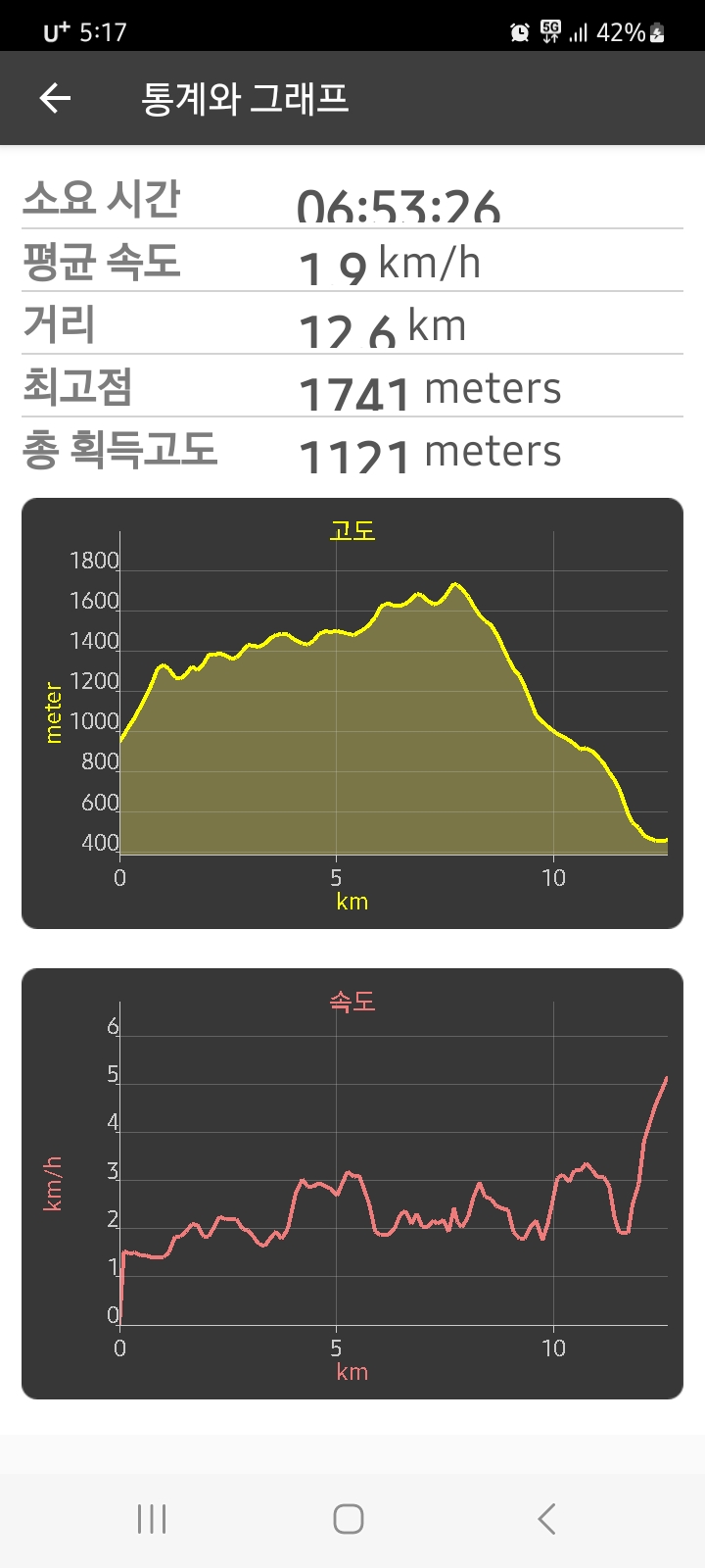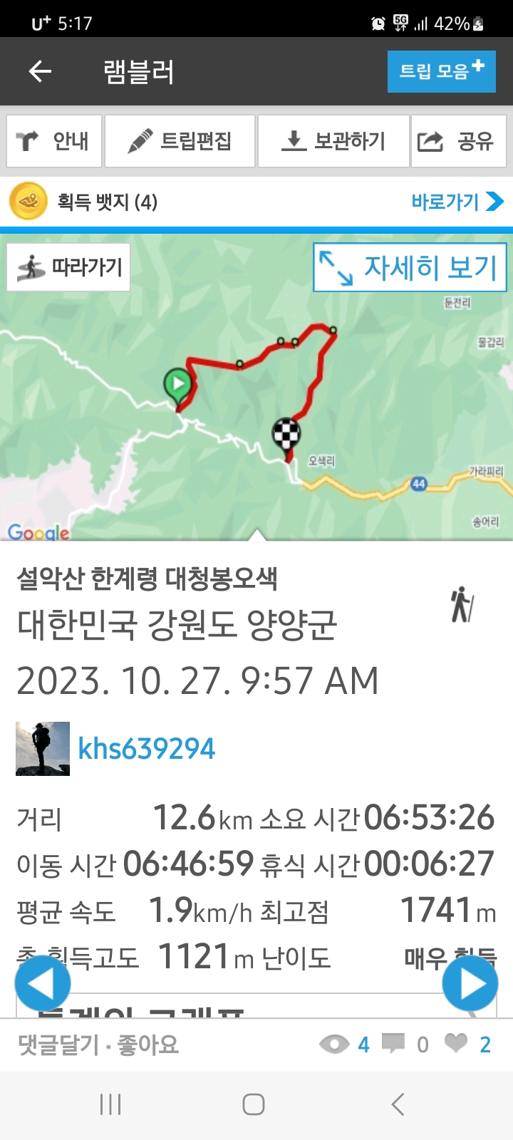 [국내여행]설악산 가을단풍 안개 가랑비산행 작성자얼쑤.|작성시간23.10.27|조회수198 목록 댓글 1 글자크기 작게가 글자크기 크게가 http://rblr.co/omb4C설악산 한계령 대청봉오색활동 : 등산/하이킹 | 소요 시간 : 6h 53m 26s | 거리 : 12.6 km (7.8 mi) | 총 획득고도 : 1121 m (3,678 ft) | 최고점 : 1741 m (5,712 ft) | 평균 속도 : 1.9 km/h (1.2 mi/h)www.ramblr.com 다음검색 현재 게시글 추가 기능 열기 북마크 공유하기 신고 센터로 신고 댓글 댓글 1 댓글쓰기 댓글 리스트 작성자주 몽 | 작성시간 23.10.27 얼수님 빠름빠름 입니다.산행기 잘보았습니다. 댓글 전체보기