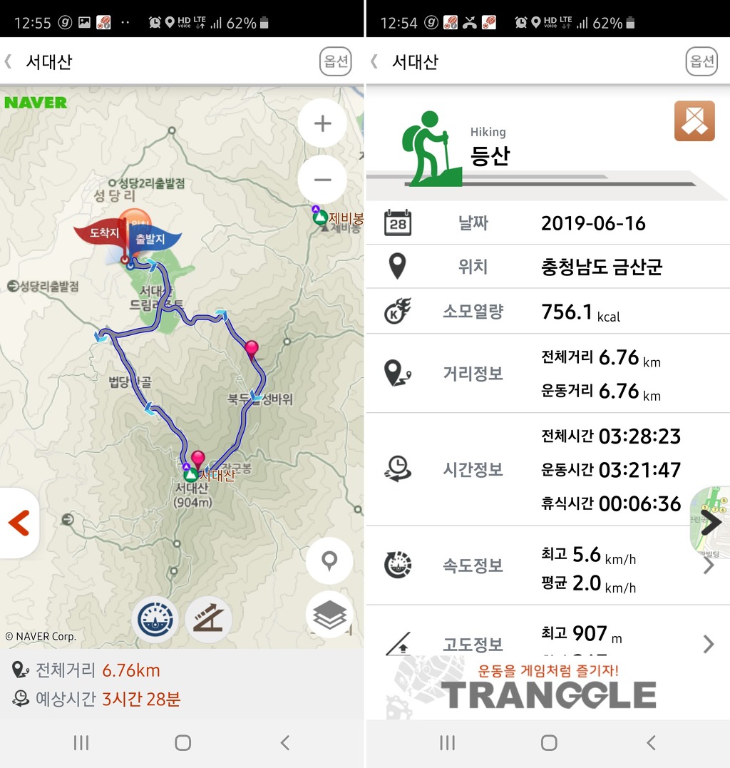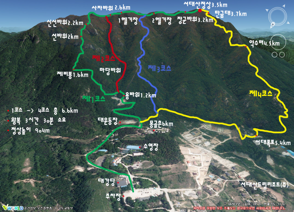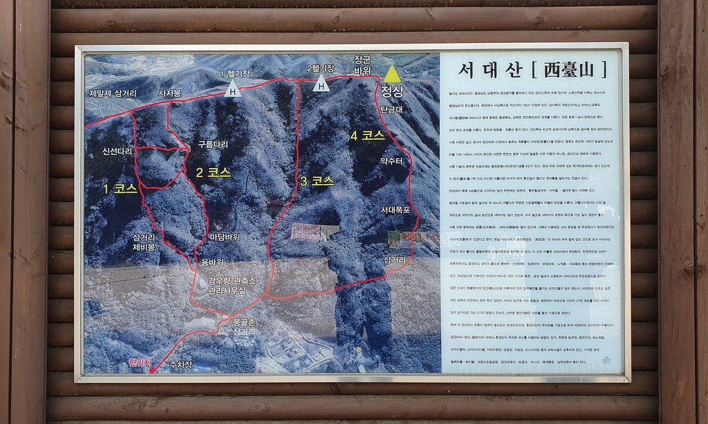 드림리조트 주차장-산행1코스로 등산-강우레이더관측소-서대산 정상-산행4코스로 하산-개덕사-서대폭포-드림리조트 주차장 원점회귀