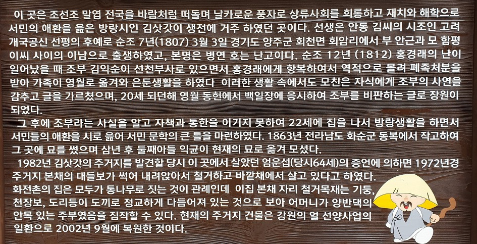 김삿갓 유적지는 강원도 영월군 하동면 와석리 노루목에 위치하고 있으며,