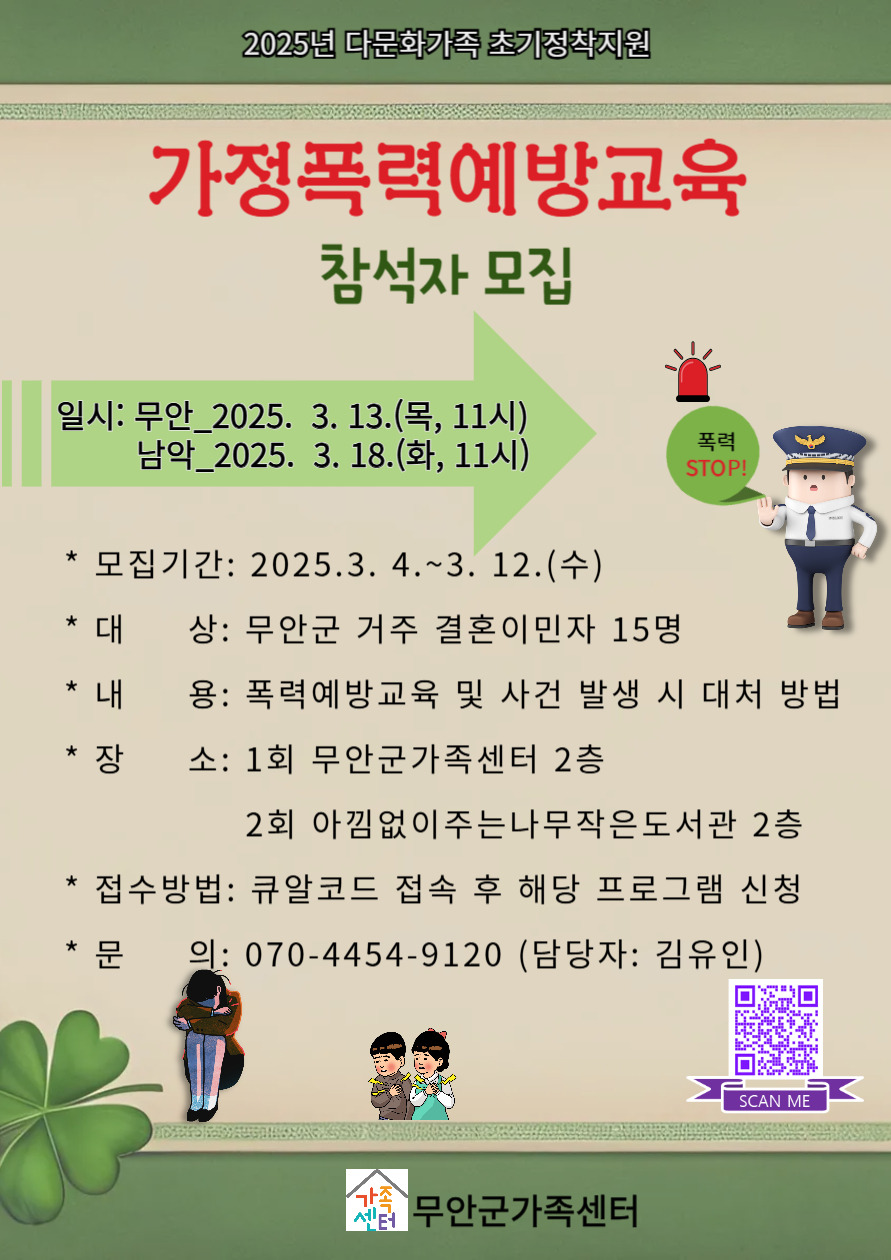 2025년 다문화가족 초기정착지원사업 안내 작성자무안군다문화|작성시간25.03.04|조회수11 목록 댓글 0 글자크기 작게가 글자크기 크게가 2025년 초기정착지원사업 안내입니다.올해도 여러분에게 유익한 교육 프로그램을 준비되어 있으니 많은 참여 신청부탁 드립니다.감사합니다. 다음검색 현재 게시글 추가 기능 열기 북마크 공유하기 신고 센터로 신고 댓글 댓글 0 댓글쓰기 답글쓰기 댓글 리스트