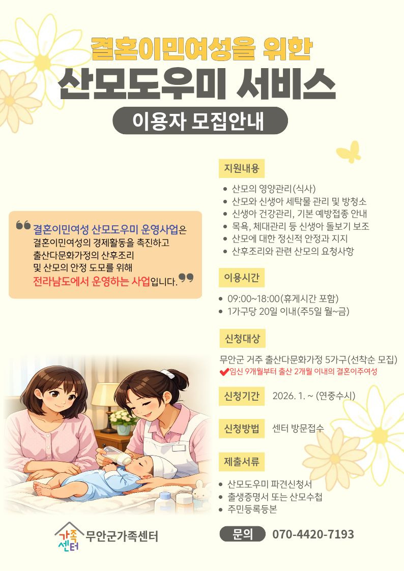2026년 산모도우미 신청 안내(접수마감) 작성자무안군다문화|작성시간26.01.13|조회수13 목록 댓글 0 글자크기 작게가 글자크기 크게가 무안군가족센터에서 출산 다문화가정에 산모도우미를 파견해드립니다.연중 모집하고 있으니 아래 내용 보시고, 신청하세요~*담당자 직통번호: 070-4420-7193 다음검색 현재 게시글 추가 기능 열기 북마크 공유하기 신고 센터로 신고 댓글 댓글 0 댓글쓰기 답글쓰기 댓글 리스트