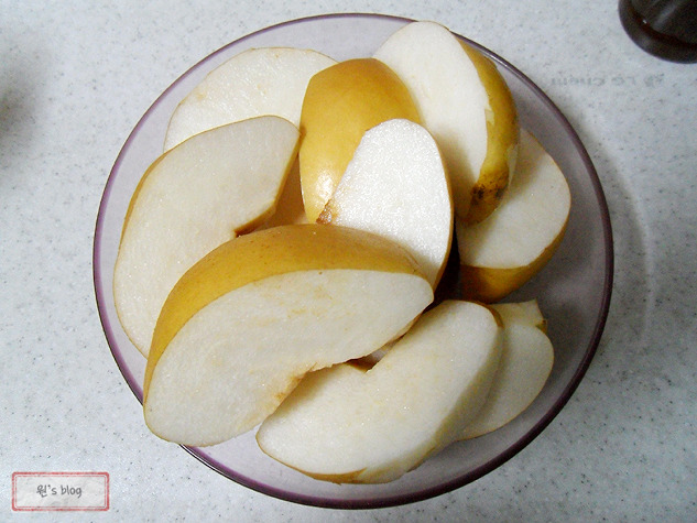배는 깨끗이 씻어 큼직하게 자르고 씨부분을 파냈어요.