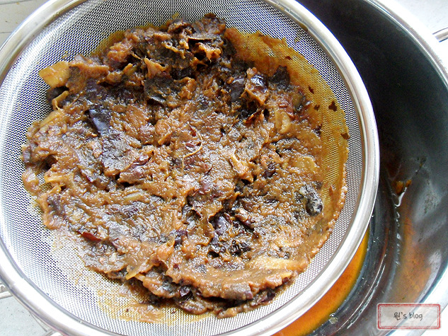 주걱이나 국자로 꾹꾹 짓이겨가면서 걸러내면