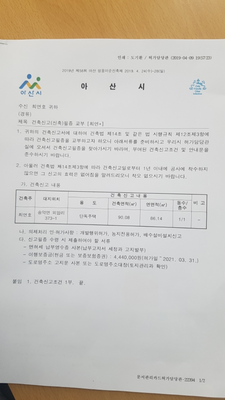 건축허가서 발급 작성자흙집|작성시간19.04.15|조회수1,298 목록 댓글 0 글자크기 작게가 글자크기 크게가 아산시청에서건축허가서 찾아왔습니다. 다음검색 현재 게시글 추가 기능 열기 북마크 공유하기 신고 센터로 신고 댓글 댓글 0 댓글쓰기 답글쓰기 댓글 리스트