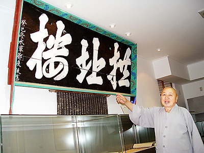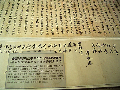 | 흥국사 유물전시관에 보관된 ‘영취산 흥국사 심검당 중건 상량문’. 1812년 효암충일 스님이 썼으며 의승수군 300여명의 명단이 기록돼 있다. | ||