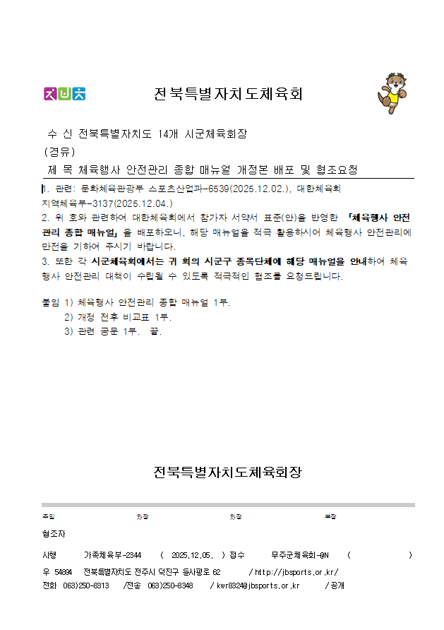[대한체육회]체육행사 안전관리 종합 매뉴얼 개정본 배포 작성자고목나무|작성시간25.12.09|조회수85 목록 댓글 0 글자크기 작게가 글자크기 크게가 (붙임1)체육 행사 안전관리 종합 매뉴얼_2판.pdf1.76MB(붙임2) 체육 행사 안전관리 종합 매뉴얼 개정 전후 비교표.hwp43.50KB 첨부파일첨부된 파일이 3개 있습니다. png 파일 capture-20251209-125531.png 다운로드 pdf 파일 (붙임1)체육 행사 안전관리 종합 매뉴얼_2판.pdf 다운로드 hwp 파일 (붙임2) 체육 행사 안전관리 종합 매뉴얼 개정 전후 비교표.hwp 다운로드 다음검색 현재 게시글 추가 기능 열기 북마크 공유하기 신고 센터로 신고 댓글 댓글 0 댓글쓰기 답글쓰기 댓글 리스트