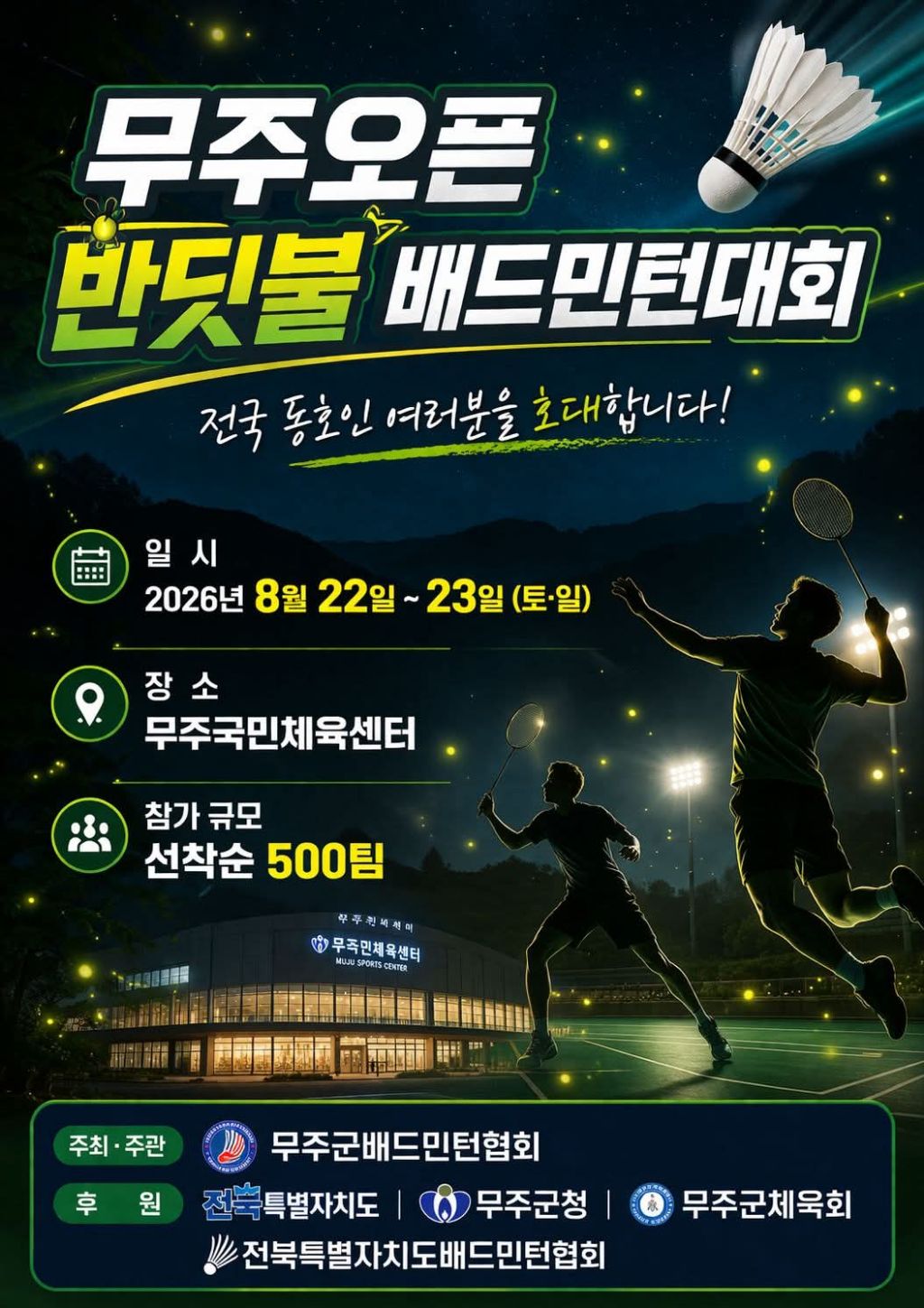 2026 무주오픈 반딧불 배드민턴대회 작성자고목나무|작성시간26.04.06|조회수7 목록 댓글 0 글자크기 작게가 글자크기 크게가 다음검색 현재 게시글 추가 기능 열기 북마크 공유하기 신고 센터로 신고 댓글 댓글 0 댓글쓰기 답글쓰기 댓글 리스트