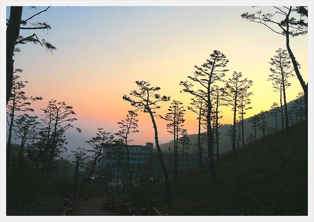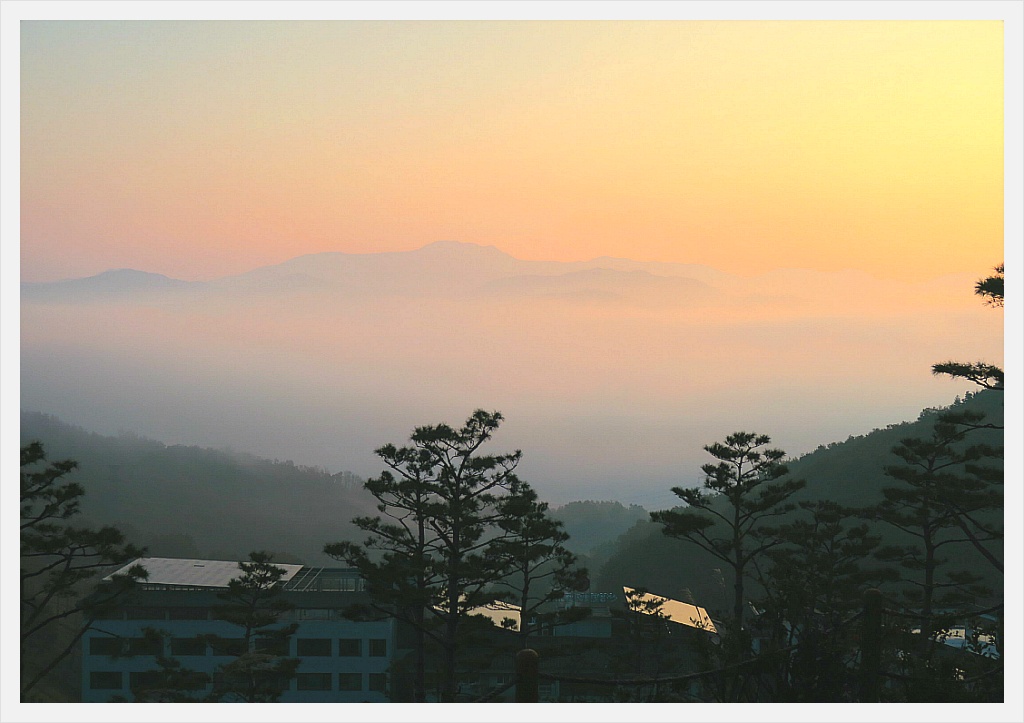 ▼자욱한 안개속에 황매산이 밝아오는 여명속에 잠겨있다.
