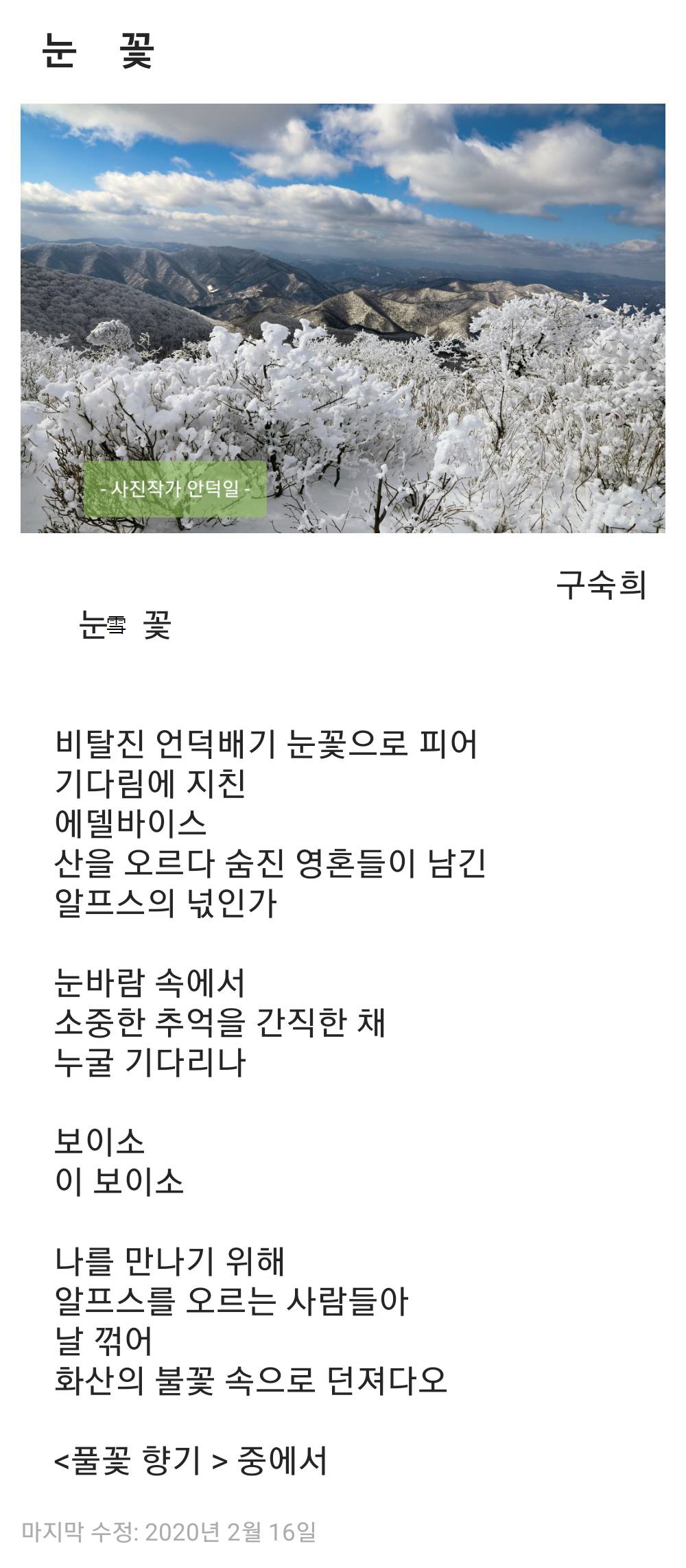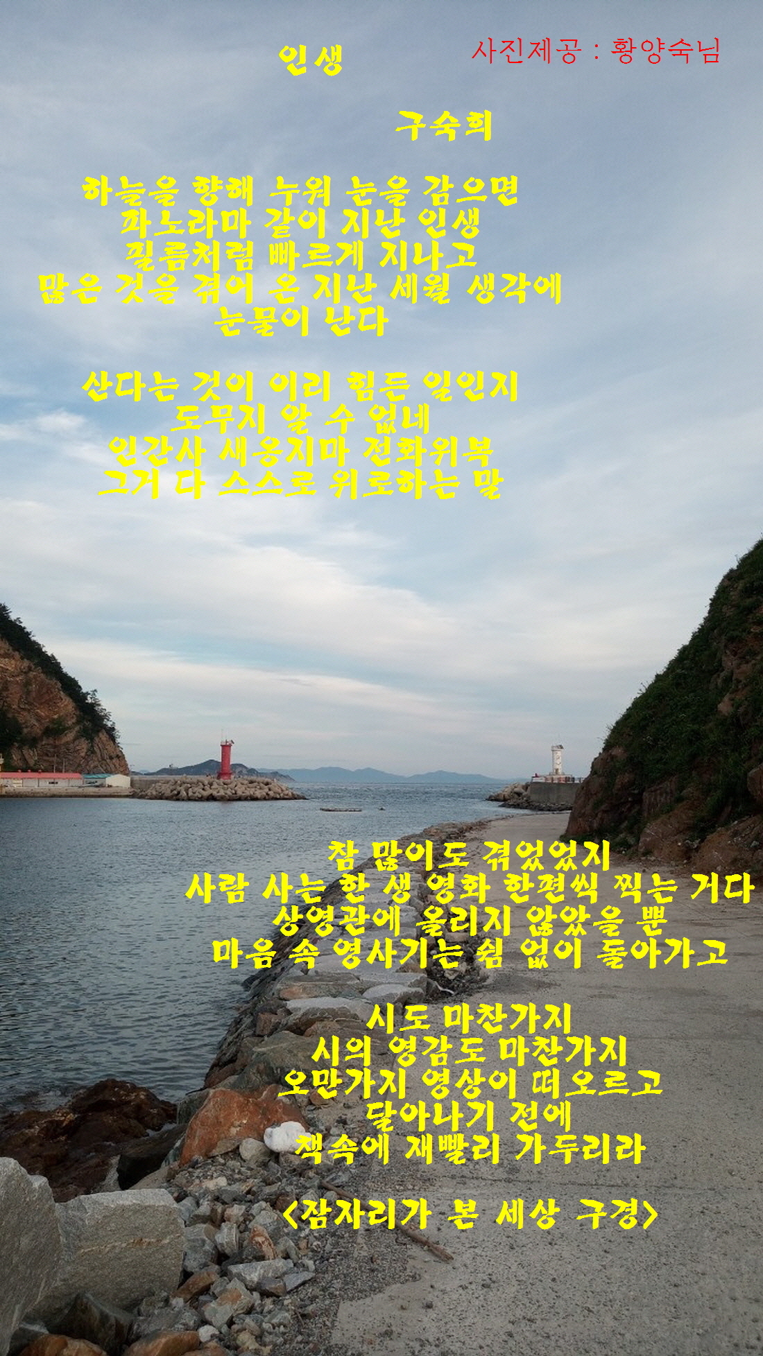 눈 꽃(설화), 마음의 여유, 인생 (시원해지면 하는 마음에서) - 올려봅니다. 작성자프리텐|작성시간21.07.27|조회수62 목록 댓글 0 글자크기 작게가 글자크기 크게가 모임 일행이 말도에서 전해준 사진이랍니다. 다음검색 현재 게시글 추가 기능 열기 북마크 공유하기 신고 센터로 신고 댓글 댓글 0 댓글쓰기 답글쓰기 댓글 리스트