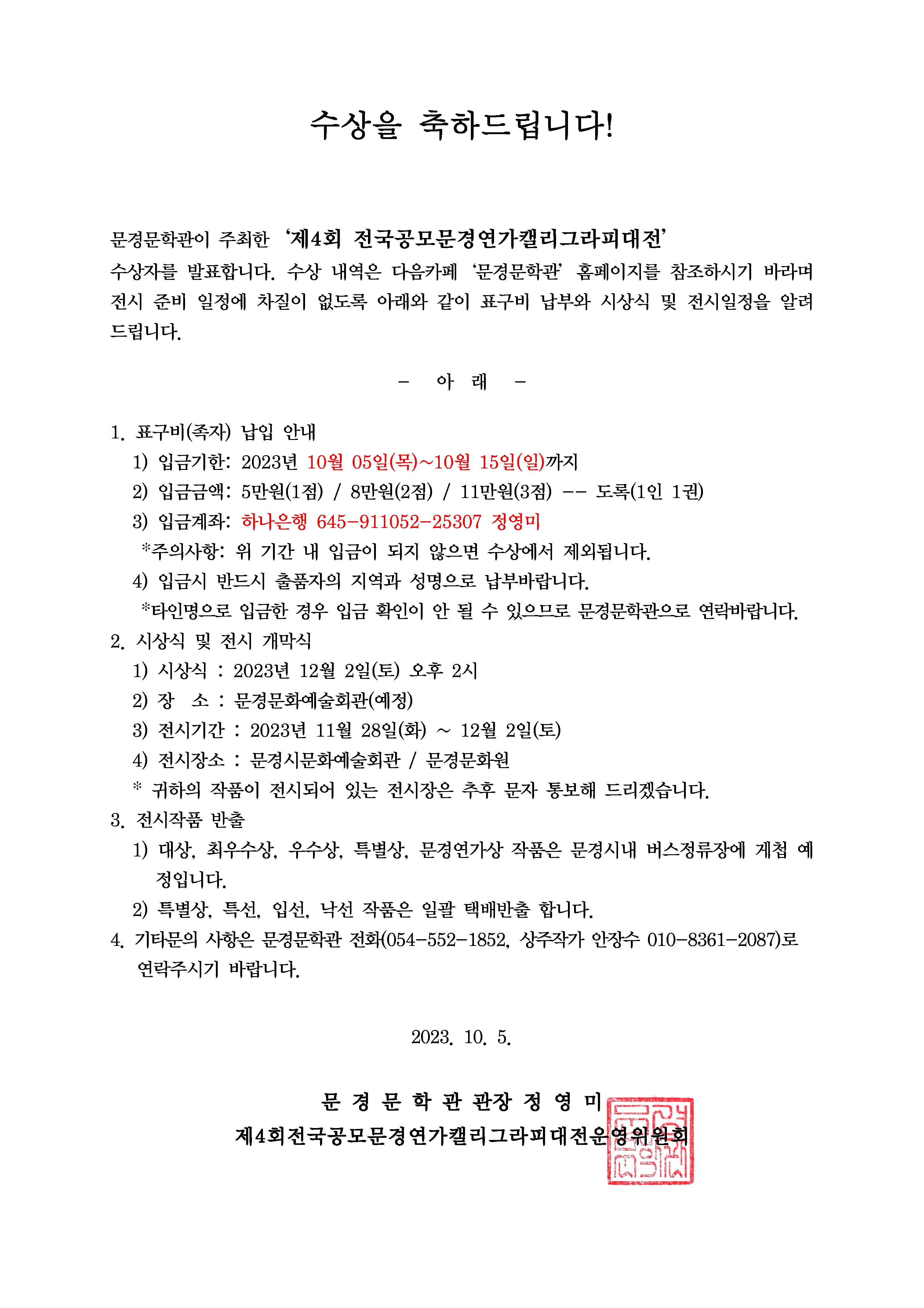 제4회 전국공모 문경연가캘리그라피대전 수상자 발표