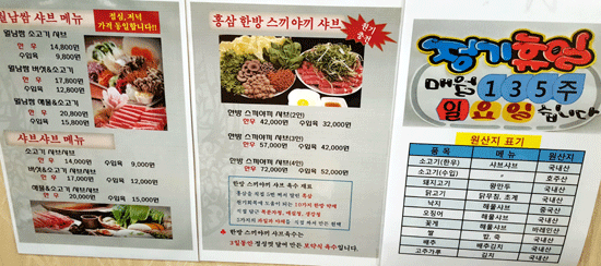 차림표 : 월남쌈 소고기샤브샤브 한우14800원.수입육9800원. 한방홍삼스끼야끼샤브 한우42000원(2인),수입육32000원. 월남쌈 버섯소고기 샤브샤브 한우17800원.수입육12800원