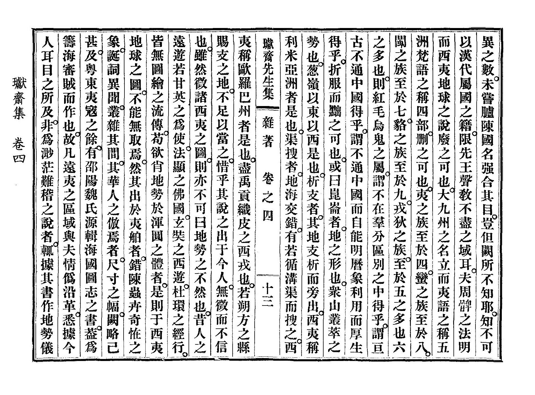 《或曰崑崙者.地之形也.衆山叢萃之勢也.葱嶺以東以西是也.析支者.其地支析而旁出.西夷稱利米亞洲者是也.渠搜者.地海交錯.有若循溝渠而搜之.西夷稱歐羅巴州者是也.盡禹貢織皮之西戎也.若朔方之縣賜支之地.不足以當之.》