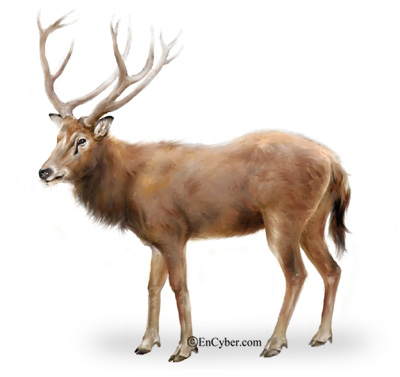 特徵 : 麋鹿俗稱四不像,其頭臉細長似馬、角多叉似鹿、頸長似駱駝(一說為蹄似牛)、尾端有黑毛,似驢。成年麋鹿體長可達1.9至2.2公尺,體重可達135至200公斤。雄性有角,且每年最多有兩副,夏季的較大,並在六至八月的發情期結束後,於十一月脫落;若有第二副角,則會在一月前生長完全並在數星期後脫落。夏季毛為紅棕色,冬季毛較粗濃,呈灰黑色。麋鹿四肢粗大:主蹄寬大能分開,多肉,趾間有皮腱膜,有很發達的懸蹄,行走時帶有響亮的磕碰聲;側蹄發達,適宜在沼澤地中行走和活動;長而多毛的尾,利於驅趕飛擾的昆蟲.〉