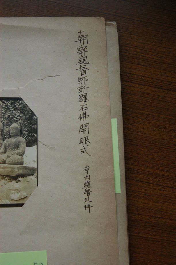 여기서 중요(重要)한 것은, 「‘조선총독부 신라석불 개안식’이라고 쓰여진 불상사진 보존지(커버). 데라우치 총독이 예배했다는 문구도 적혀있다.」고 한 것이다.