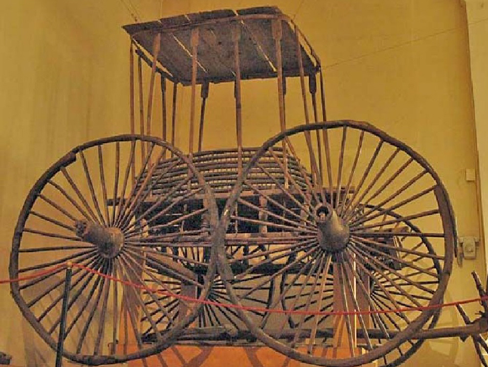 그 출토[出土]된 유물[遺物]들 중에는, 33개[三三個]의 바퀴살로 만들어진 수레가 있었다.