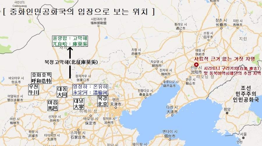 ※ 시라토니 구라키치(白鳥 庫吉 : 일제 관변 사학자)의 주장에 따르면, 현재 요녕성(遼寧省)의 시마무렌강(西拉-木倫河) ' 조양(朝陽) 이북 지역에 고막해(庫莫奚)가 있다고 하였습니다. 물론 동북아역사재단의 주장과 동일합니다.