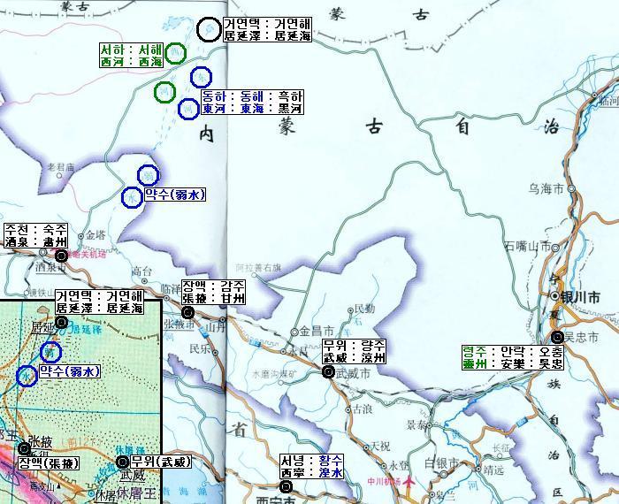 금섬서감주위서유장액하, 즉고강곡수.. 출강중, 북류지위서위장액하, 합약수, 동북입거연해, 속위지흑하..