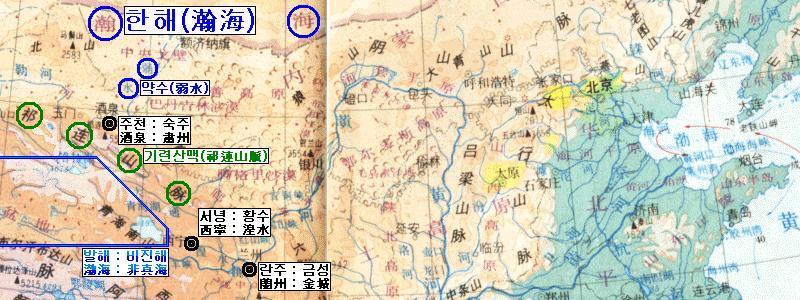 현 감숙성(甘肅省) 서북부에 위치하는 소곤륜산(小昆侖山)에서 나와 동남쪽으로 향하는 가운데에 위치하는 사막은 현재 내몽고 서북부의 한해(瀚海)인데, 한해(瀚海)가 바로 대막(大漠)이라는 것이다..