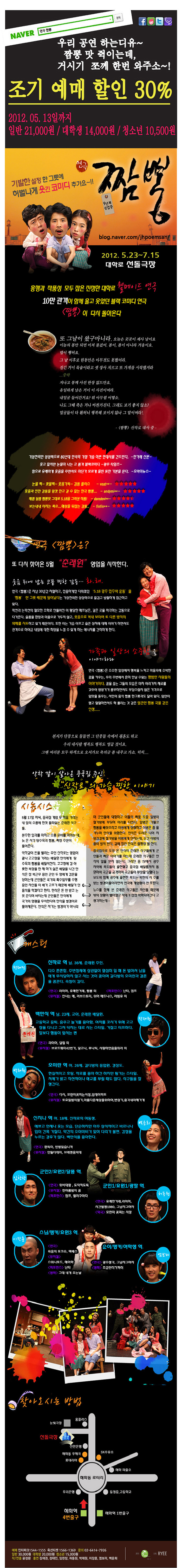 연극'짬뽕' < 5월23일~7월15일 / 2012 > 대학로 선돌극장 작성자와우|작성시간12.05.06|조회수7 목록 댓글 0 글자크기 작게가 글자크기 크게가 예매 바로가기 공식블로그 바로가기 다음검색 현재 게시글 추가 기능 열기 북마크 공유하기 신고 센터로 신고 댓글 댓글 0 댓글쓰기 답글쓰기 댓글 리스트