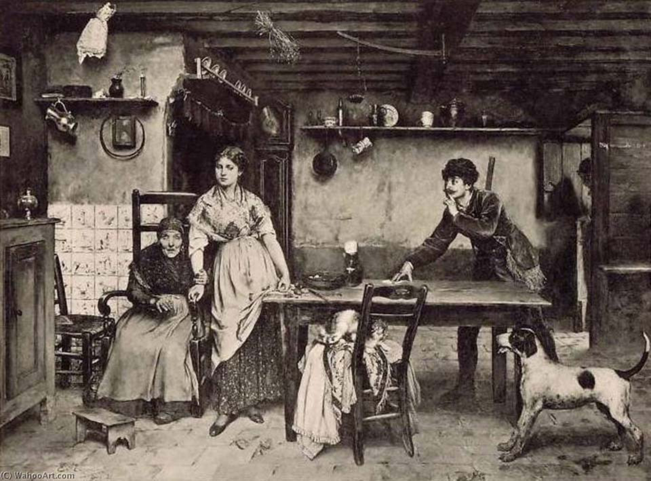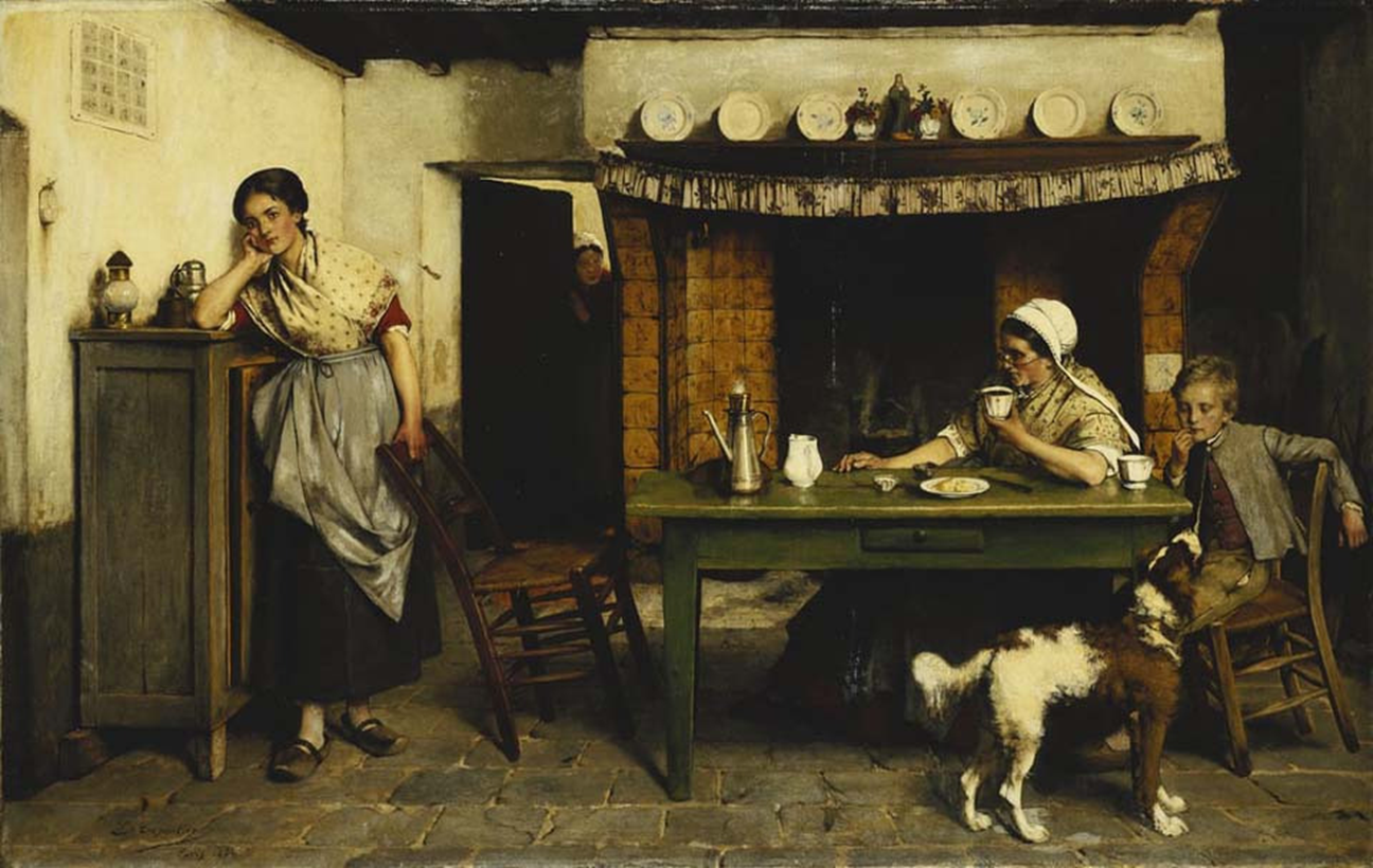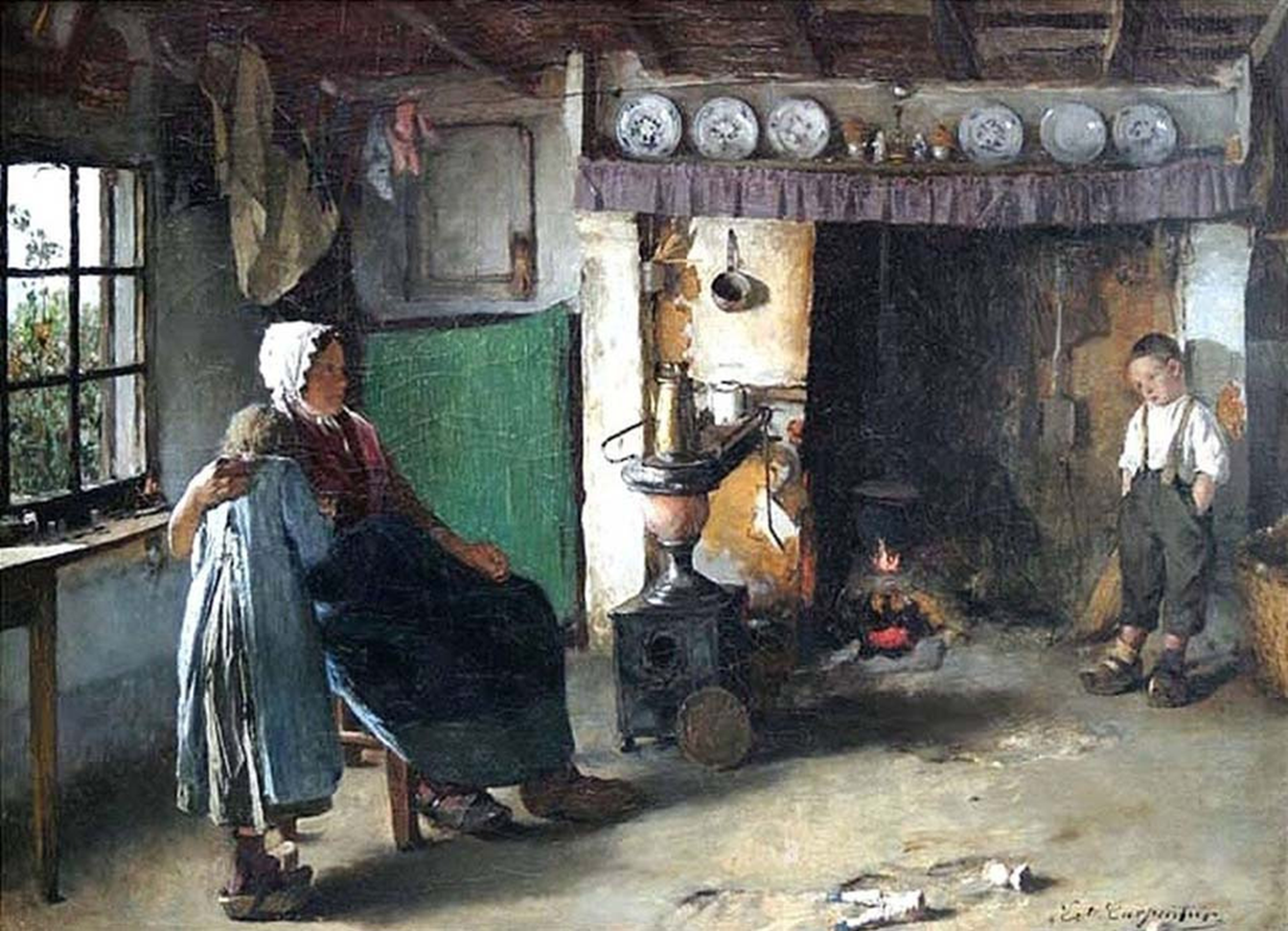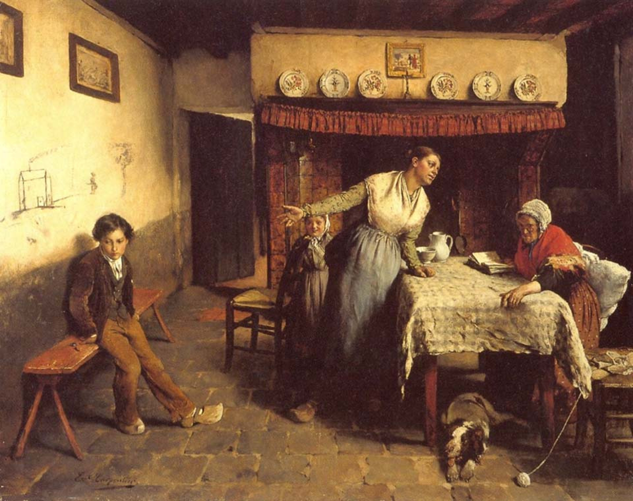 이 가족은 가난해 보이고, 아들은 나무로 된 나막신 하나를 바닥에 떨어뜨린 채 단순한 테이블 모서리에 앉아 있다. 여러 겹으로 패치한 옷을 입은 그는 이미지의 왼쪽 가장자리 너머에서 이미지에서 벗어난 인물에게 꾸중을 듣고 있다.