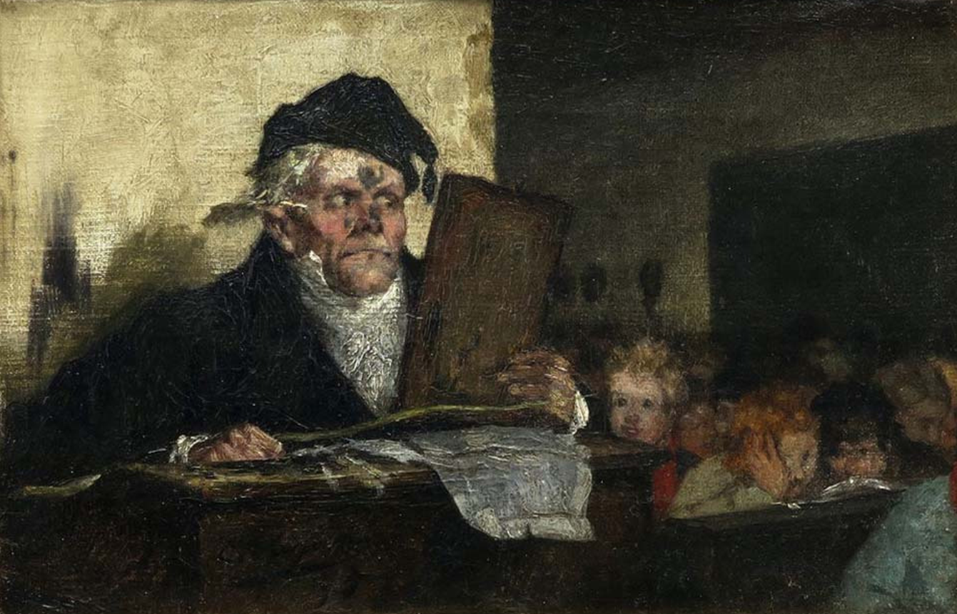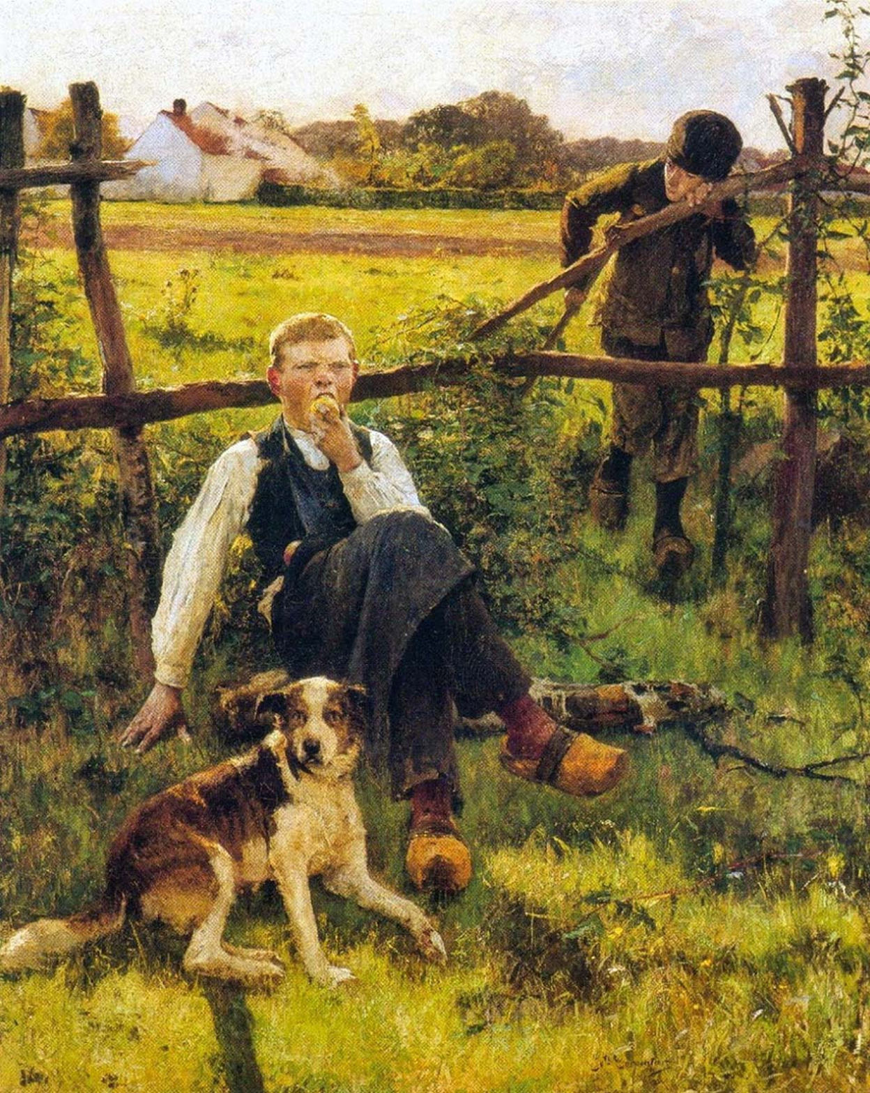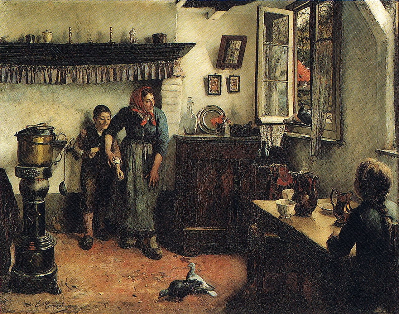 이 가족은 가난해 보이고, 아들은 나무로 된 나막신 하나를 바닥에 떨어뜨린 채 단순한 테이블 모서리에 앉아 있다. 여러 겹으로 패치한 옷을 입은 그는 이미지의 왼쪽 가장자리 너머에서 이미지에서 벗어난 인물에게 꾸중을 듣고 있다.