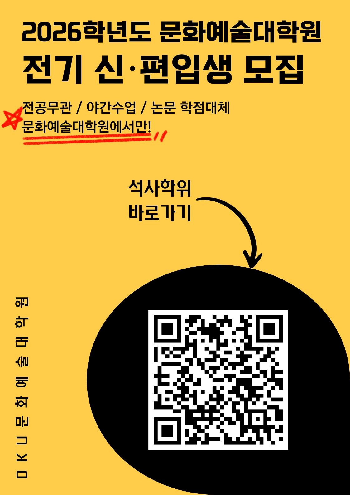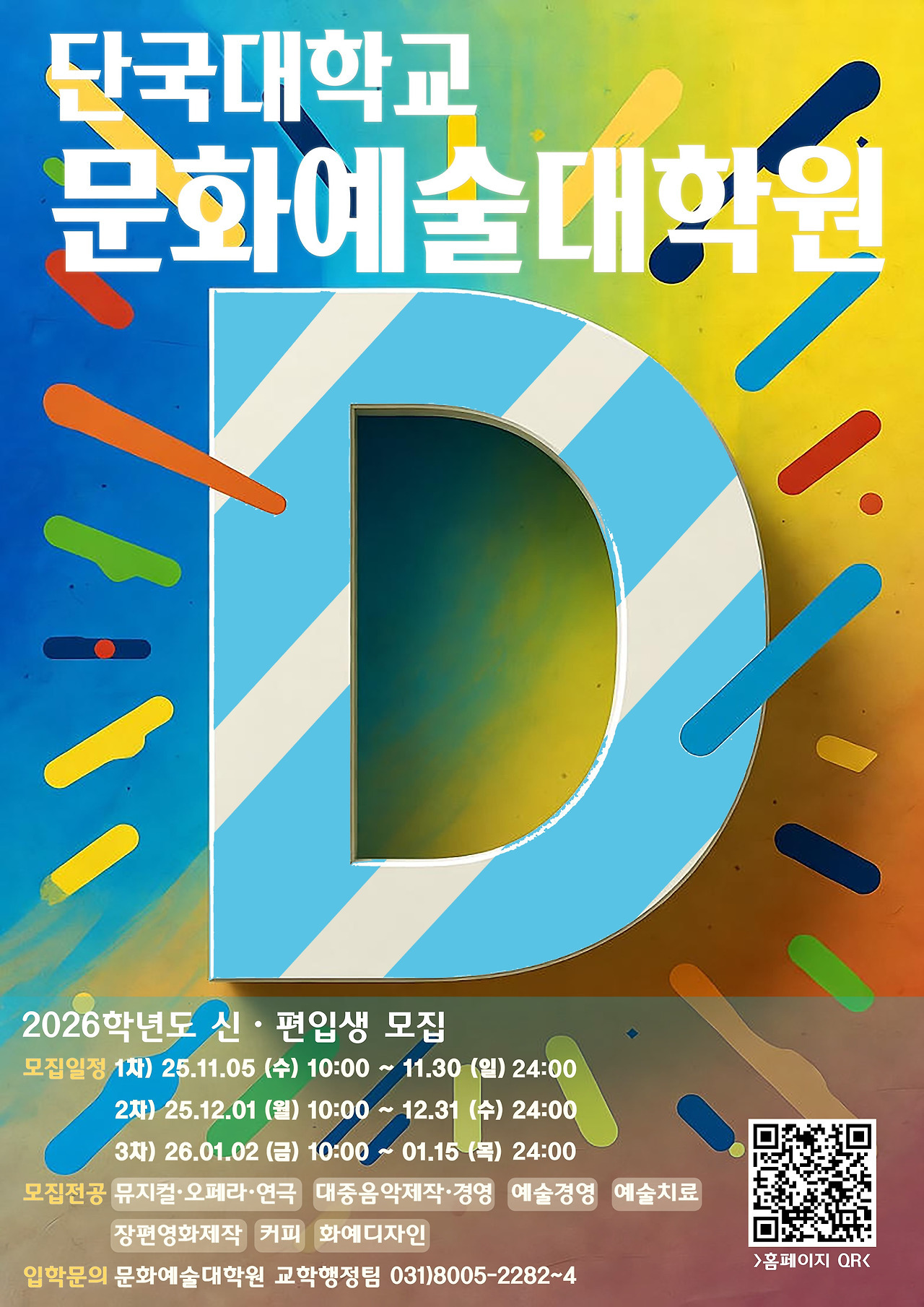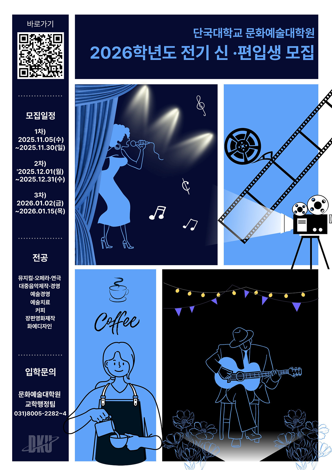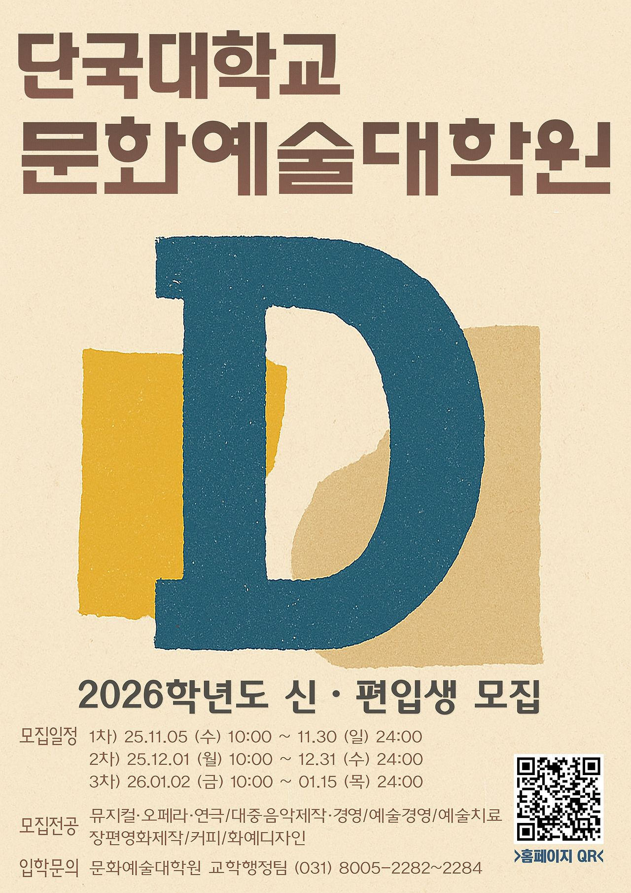 단국대학교 문화예술대학원 2026전기 신·편입생 모집 안내 작성자김민주 조교 (기악과)|작성시간25.11.20|조회수18 목록 댓글 0 글자크기 작게가 글자크기 크게가 다음검색 현재 게시글 추가 기능 열기 북마크 공유하기 신고 센터로 신고 댓글 댓글 0 댓글쓰기 답글쓰기 댓글 리스트