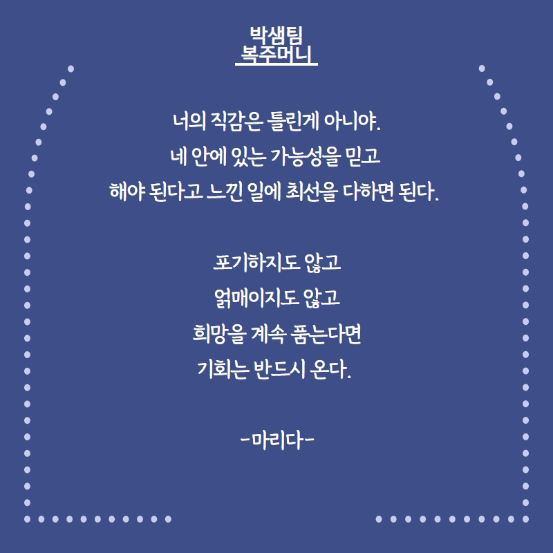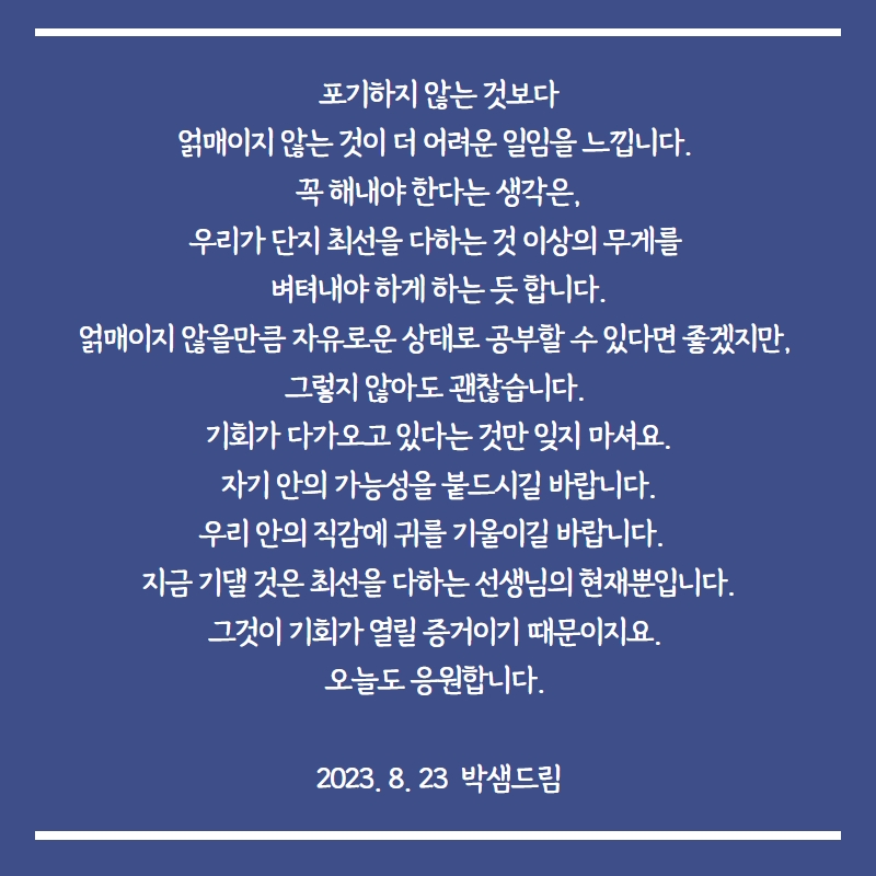 그러니 힘 내시고 지금처럼 우직하게 한 걸음씩 나아가시길 바랍니다.