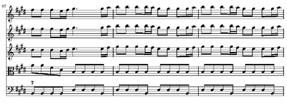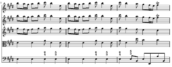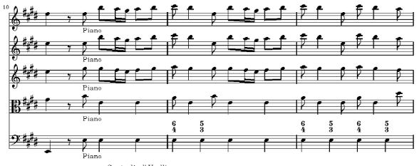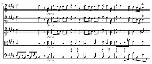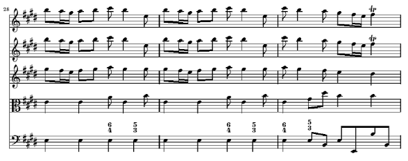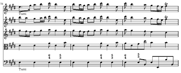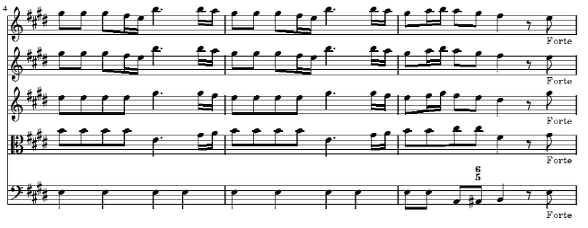 다음의 4~6마디는 세째 마디의 d#과 b를 제외한 것을 빼고는 처음 세 마디의 완벽한 반복 형태입니다 그러한 두 음의 생략에 의한 반복은 두 악구 간에 큰 차이가 없는 것 같지만 실제로 음악에서는 형식을 구분해 주고 음악을 구조적으로 만들어 주는 아주 중요한 방법이 됩니다 물론 비발디는 여기에서 바로크 음악의 특징 중의 하나인 같은 선율을 강약을 대비시켜 등장시켜서 악구를 대비시키는 방법을 추가해서 사용하고 있습니다(4~6 마디는 p로 연주) 여기에서 작곡 기법적으로 주목할 것은 등장하는 다섯 개의 성부가 서로 크게 다르지 않고 일제히 주선율의 움직임을 따르고 있다는 것입니다 최저 성부는 좀 다르게 나타나는데 1, 2, 4, 5 마디에서는 계속 E음만을 연주하여 마치 Timpani로 연주하는 것과 같은 강한 효과를 내고 있습니다 3, 6 마디에서는 종지적인 흐름을 위해 최저음이 8 분 음표로 바뀌어 화성에 변화를 줍니다