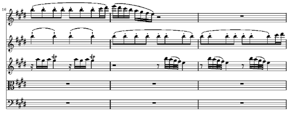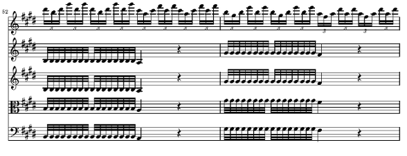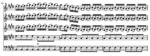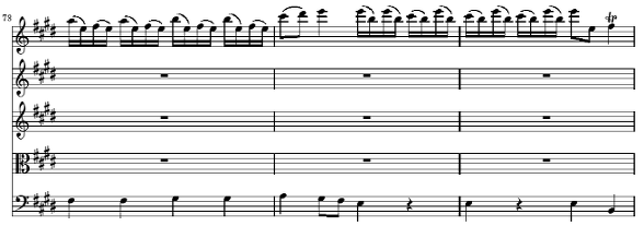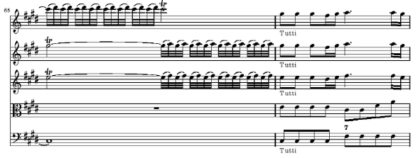 70마디부터 76마디까지의 B 역시 지금까지 등장했던 요소들이 변화된 채 혼합되어 새로운 분위기를 만들어 가고 있습니다 우선 70에서 72마디 까지 독주 바이올린에 두 번 등장하는 16분 음표의 전과적 비화성음을 동반하는 상행 음계는 45마디에서 묘사된 벼락의 모티브(옥타브 음역 내에서의 진행)에서 온 것이며 72 마디에서 75 마디의 독주 바이올린에 나타난 부분 역시 앞의 21에서 27마디에 까지 등장했던 새의 노래에서 가져온 것입니다 이 부분 역시 서로 다른 부분에서 씌였던 소재들을 새롭게 결합한 부분입니다 그렇게 서로 다른 부분에서 가져 온 모티브들을 새롭게 결합할 수 있었던 것은 시간 차이를 두고 다른 요소 속에 있던 공통점(여기에선 리듬이 주요 요인)을 찾아낸 데에 있지 않나 생각 됩니다 아니면 처음부터 그러한 공통점들을 생각해 내고 곡을 썼을 수도 있습니다 70마디에는 이 악장의 두번째이자 마지막 Tasto Solo(76마디의 Tutti 전까지 지속)가 건반악기 파트에 사용됩니다
