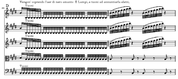 이 D부분에서의 작곡자의 의도는 sonetto의 내용에 맞는 분위기를 그리기 위해 독주 바이올린을 기교적으로 부각시키는 것이고 그러기 위해서 나머지 4성부가 독주 바이올린과 대비되는 구조를 만들어 가도록 하고 있습니다 즉 나머지 네 성부는 이 부분을 통해서 항상 유니슨으로 진행하고 있으며 독주 바이올린에 강렬함을 더 해 주기 위해 리듬을 극도로 단순화시켜 연속적인 트레몰로로 반주하고 있습니다