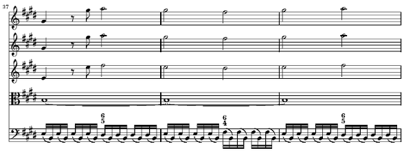이어서 다시 41마디에서 44마디 까지에는 짧막한 리토르넬로가 다시 등장합니다 이 부분은 앞에 등장했던 두 번째 리토르넬로 부분(28~31)을 그대로 유지한 채 딸림화음권으로 이동시켰습니다 역시 변화를 주는 발전의 방법은 쓰이지 않고 딸림화음권으로 그대로 이동시켰습니다