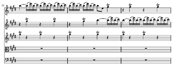 이 곡에서 A 부분은 먼저 총주로 다음과 같이 E major로 등장합니다