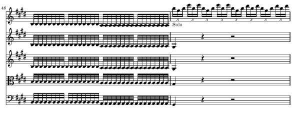 여기에서 아래 네 성부가 모두 유니슨으로 진행하는 동안 그와는 대조적으로 독주 바이올린은 47마디에서부터 55마디까지 화음을 펼쳐 기교적인 움직임을 보여 줍니다 물론 비발디는 독주 바이올린이 음역을 넓게 자유스럽게 드나드는 화려한 기교를 자랑하도록 하는 것이 아니고 저음을 고수하고 있는 아래 네 성부와 대조되게 한정된 고음역 내에서만 고집스럽게 움직이도록 합니다 이러한 두 가지 강렬하고 대비적인 요소의 효과를 강조하고 고조시키기 위해 두 가지 요소를 교차로 사용합니다