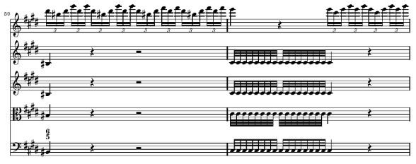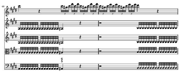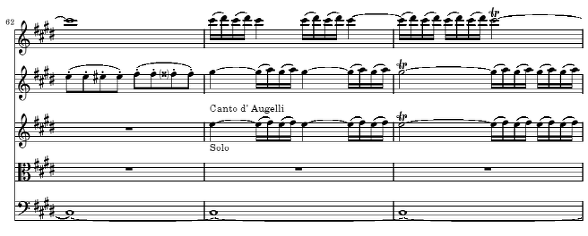 앞에 등장했던 B의 13~27 마디가 많이 변화되었기 때문에 반복한다기 보다는 새들의 노래에 대한 기억을 되살려 주는 정도에서 진행을 한다고 볼 수 있습니다 59 마디의 독주 바이올린에 등장하는 새의 노래는 이미 13에서 17 마디 사이에서 등장했던 것을 변화시킨 것으로 두 마디 후에 제1바이올린의 솔로로 반복되어지는데 매우 제한적이지만 이곳에 마치 푸가의 주제에 따른 응답 기교를 연상시키는 기술을 사용합니다 즉 59 마디에서 제시된 독주 바이올린의 선율을 61마디에서 조적응답으로 실현하기 위해서 61마디의 마지막 음이 d#으로 되어진 것을 볼 수 있습니다 푸가적인 응답이라기 보다 푸가적인 개념만을 빌어온 부분이라고 생각됩니다