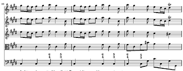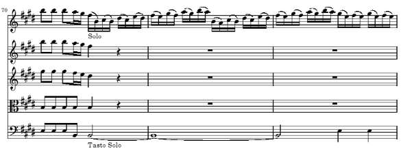 59마디의 아래 성부에 있는 <Tasto Solo>란 지금까지 숫자저음에 의해 연주해 오던 쳄발로가 숫자저음에 의해 연주해 가던 것을 여기에서 멈추고 악보에 나타난 음만을 연주하는 것을 의미합니다 그러니까 이전까지는 숫자저음을 풀기 위해서 쳄발로가 상성부에 오른손을 같이 사용했었는데 여기에서는 왼손만을 사용하여 C#음 하나만을 연주합니다 비발디는 이 악장의 첫 마디에 보는 것처럼 악보에 이 파트를 Organo e Violoncello라고 해 놓았는데 오르간이 있는 연주회장에서는 오르간으로 길게 음을 지속할 수 있었던 것을 염두에 두었던 것 같습니다 쳄발로로 연주한다면 음이 길게 지속이 되지 못하지만 violoncello로 같은 성부를 길게 지속할수 있습니다 지금 현재의 우리는 이 당시의 음악들에 대해 악기 뿐만이 아니라 음표 하나 하나를 매우 신중하게 다룰려고 하지만 그 당시에는 악보는 위와 같지만 대편성일 경우 저음악기는 필요에 따라 음역이 되는 악기(보통 건반악기, 첼로, 비올라 다 감바, 콘트라베이스, 바순등이 함께 연주)는 얼마든지 추가 할 수 있었습니다 흔히 이것을 Basso Continuo(=Generalbass, Figured bass등)라고 하는데 특별한 어느 악기나 성부를 지칭하는 말이 아니고 저음 부분을 담당하는 건반 악기와 이 부분을 함께 연주하는 저음악기를 통칭하여 부르는 용어입니다
