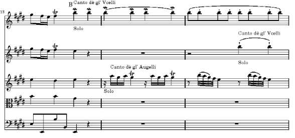 이 B에서의 성부 진행을 보면 세 성부만이 나타나는데 새의 노래를 묘사하는 이 부분에서는 다른 악기들이 쉬고 세개의 독주 바이올린 만이 연주합니다 여기에서는 세 악기가 마치 노래하는 새들처럼 반주 없이 서로 선율만을 노래하는 것이 정말 재미 있습니다 그가 사용한 재미있는 발전 방법이 B에 나타납니다 새의 노래라는 설명과 함께 시작 되는 B는 13에서 27 마디 까지인데 이 부분은 a(13~19)+b(~21)+c(~27)의 세 부분으로 나눠 볼 수 있겠습니다 세 부분으로 나눈 기준은 각 부분에 중심적으로 쓰인 음에 있습니다 a에서는 지속적으로 B음이 중심음으로 등장하고 b에서는 E음이 중심음으로 등장하고 있으며 c에서는 B와 E음이 동시에 등장하고 있습니다 물론 B전체의 뼈대를 이루고 있는 E, G#, B(으뜸화음)는 새의 노래를 묘사하기 위해서 계속 다양한 형태로 수식이 되어 집니다 13 마디의 모르덴트, 14 마디의 트릴, 15 마디의 32분 음표에 의한 하강음등이 그 예입니다 그러니까 이 B 부분은 으뜸화음의 세 음이 뼈대를 이루고 그 세 음으로 새 소리를 묘사하기 위해 계속적인 장식을 합니다 이 으뜸화음이 변치 않고 B 전체를 지배함으로 인해 지루해지기 쉬운 느낌에 변화를 주기 주기 위해 A(14)음과 C#(21마디 마지막)음 그리고 F#(25마디 마지막)음이 음색에 변화를 주기 위해 등장합니다 물론 이 세음은 E major의 II도 화음입니다 대단히 계획 되어진 방법이라고 볼 수 있습니다 그러니까 비발디가 이 곡에서 사용한 발전 방법은 주어진 모티브에 음정이나 리듬에 변화를 주어 확장시키는 방법이 아니고 앞에서 제시한 형태를 다른 위치로 이도하여 첨가시키는 방법이라고 볼 수 있습니다