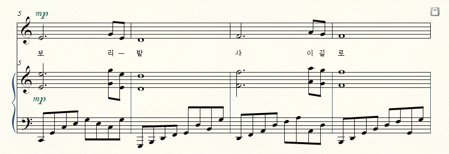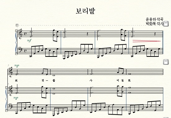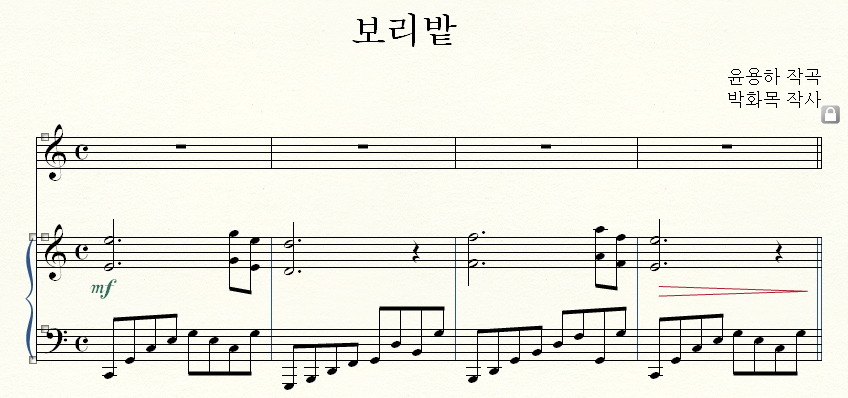 윤용하, <보리밭>이라는 가곡의 일부분을 사보하면서 해보겠습니다.
