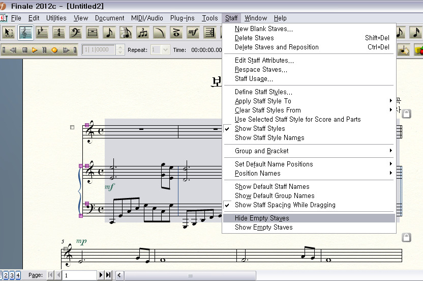 말 그대로 빈 오선을 숨기는 기능인데요, 피날레2010까지는 Page Layout Tool에 있었지만 우리가 지금 다루는 피날레2012에는 이 기능이 Staff Tool로 옮겨졌고 더 세밀하게 업그레이드되었습니다.